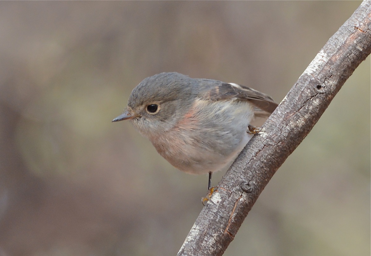Back at the sit spot, of course, EE was up, armed with camera and peering into the dark blackwood grove. And yes, she volunteered, there was a Rose Robin, and it was just over there, near that big tree, advice accompanied by a general wave of free hand. Peering, peering. A wing flap. Now I knew. So gathering up the camera/tripod I moved to get some reasonable light in the area. The little bird was happy to feed about me, and at one stage, sit on a small dead blackwood branch hanging about a metre in front of me.