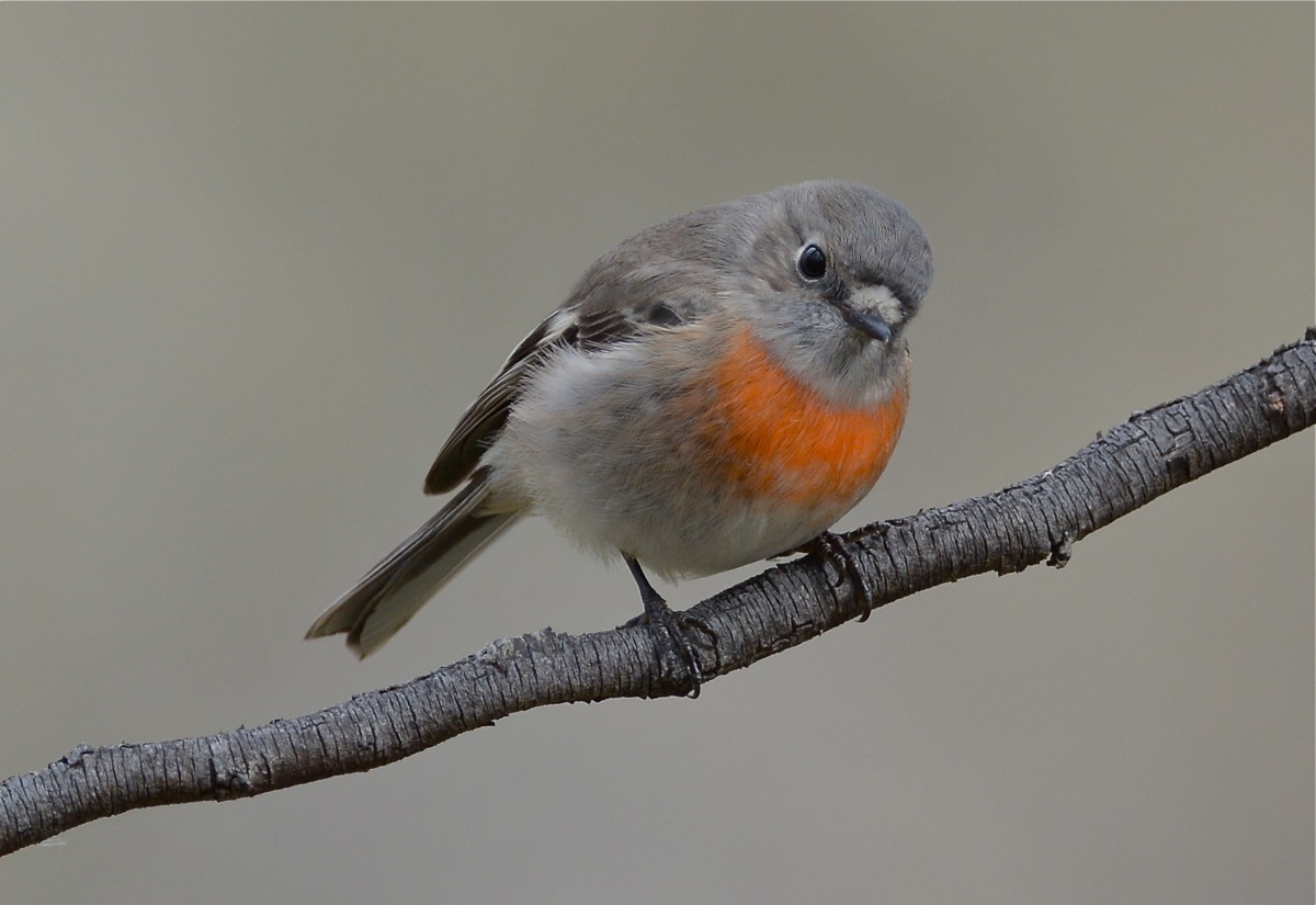 By the time I’d get the 500mm attached to the Markins Ball Head and was prepared to do battle, EE had worked out where the bird was, and to our surprise (we are always surprised) I spend half my life surprised. To find that it was in fact a female Scarlet Robin, apparently of no fixed address. Try as we might we didn’t sight a male. And this one looks, well, young. So encouraged by this, and the fact that the sun had now come out and was warming us up, we decided on a quick trip down Providence Road to the carpark to see what if any of the Flame Robins were doing. The weather being the weather, changed yet again before we reached the car and was decidedly overcast, which is when the sky went black, and I thought I might be having turn, but no. The sky was filled with the wingspans of not one, but two very low flying Wedge-tailled Eagles, and their attendant Ravens. Trying to gain speed and height they circled over the edge of the trees and had the light been with us, I might well have taken some of the best Wedge-tailed Eagles shots of my some what limited career.(yeah, yeah, blah, boring!)