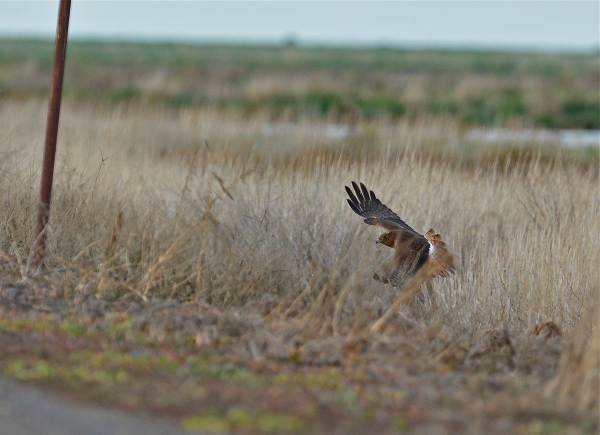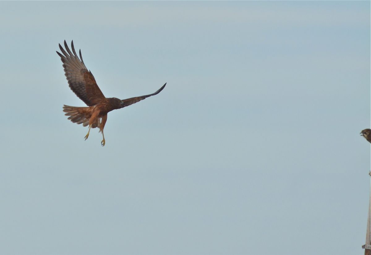 With the falcon in the grasses, the Harrier did what they do best. Hovered over the area. Eventually realising it wan’t going to get any further it pulled back and landed at the base of the falcon’s post. And sat glaring into the grasses. After a few more minutes it had obviously recovered its breath and took off to see other things. After a long time, perhaps five minutes or more the falcon emerged and flew away. It was gone by the time I’d swung the camera round.