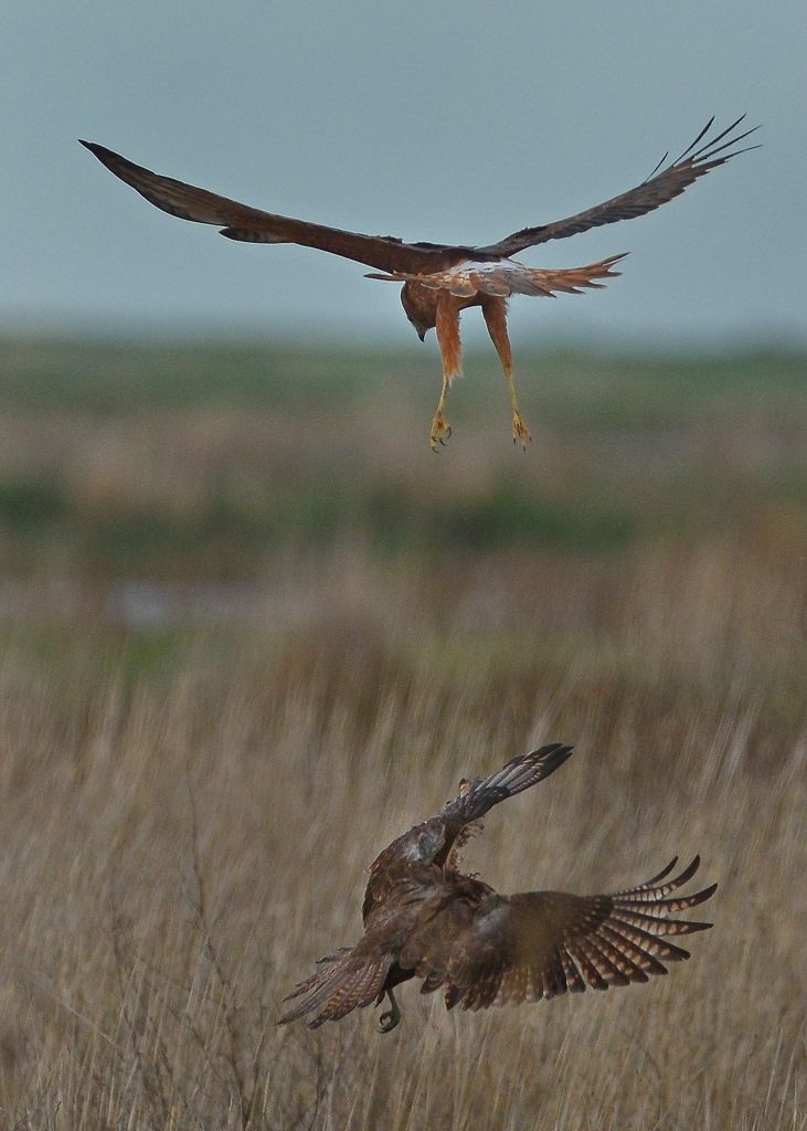 The falcon was taken completely by surprise and could only raise to defend itself. Pretty hopeless really. The long leg swung out and grained a good clawful of feathers on the lefthand wing. The flacon dropped immediately to ground, and the harrier had already steadied itself in flight and made another grasp but missed.