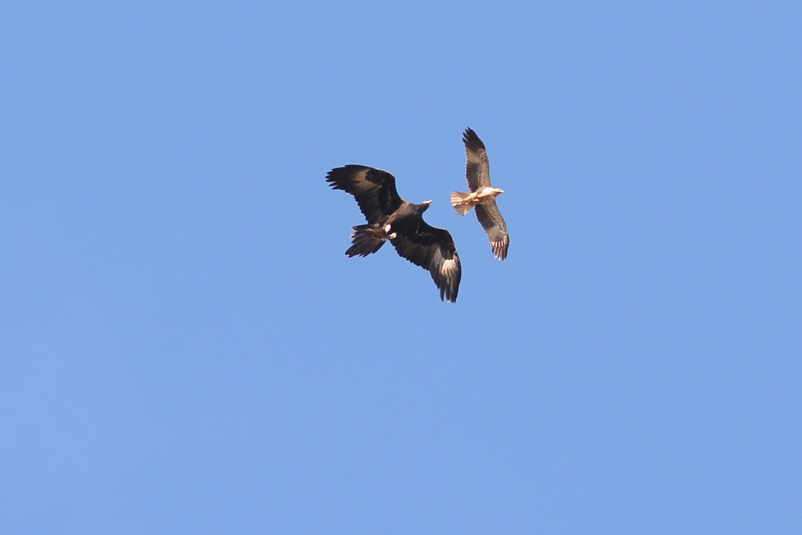 Then it all happened. Standing in the sunshine, we were assailed by the frantic Skwarks, and Chatter of a Brown Falcon, looking up we saw her belting across the sky, and in pursuit of a band (about 4) Whistling Kites. Then it was obvious the Kites were after a Wedgetailed Eagle. That was pretty evident when the sky directly above us went dark as the huge bird juggled for position in a thermal to rid itself of the pursers. But Kites are pretty much a match for a low level Eagle and managed a few good strikes among them. So much so that at one stage, they kind of got tangled up in the exit from the dive and had to avoid one another.
