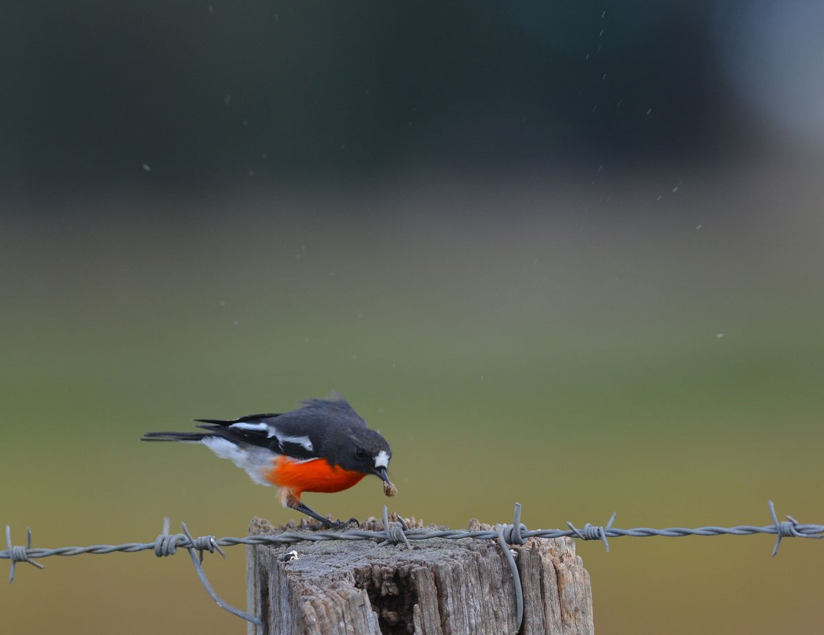 I was sitting on the ground with my feet hanging over the cliffs, like a schoolboy at the pier, watching the work of a Black Kite over the nearby treeline when I heard the familiar “chip chip” contact call of a Flame Robin. There on the roadway behind me were two males, feeding, with several juveniles on the fence line behind.