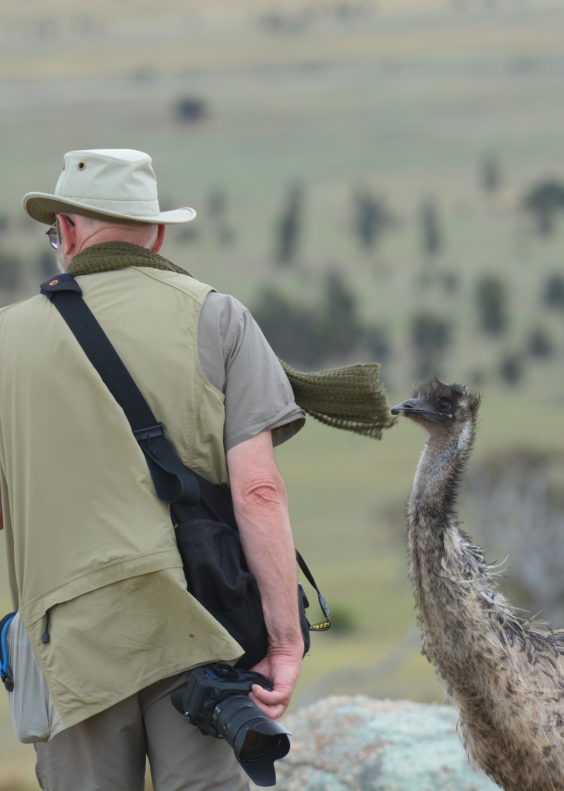 My mate An Onymous was with us and had a green neck scarf that flapped in the breeze. Fluffy seemed quite taken by said scarf and made several attempts to relieve An of it, and when he wasn’t looking to take a peek into his camera bag, just in case there was something that may suit a growing Emu.