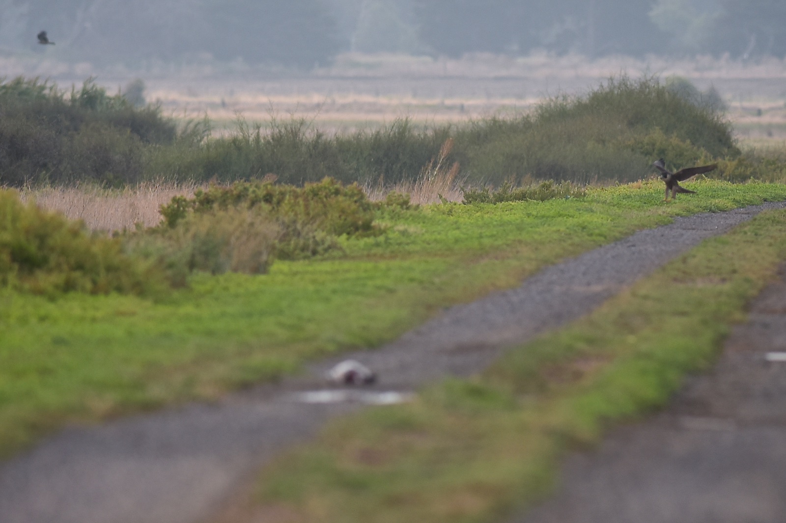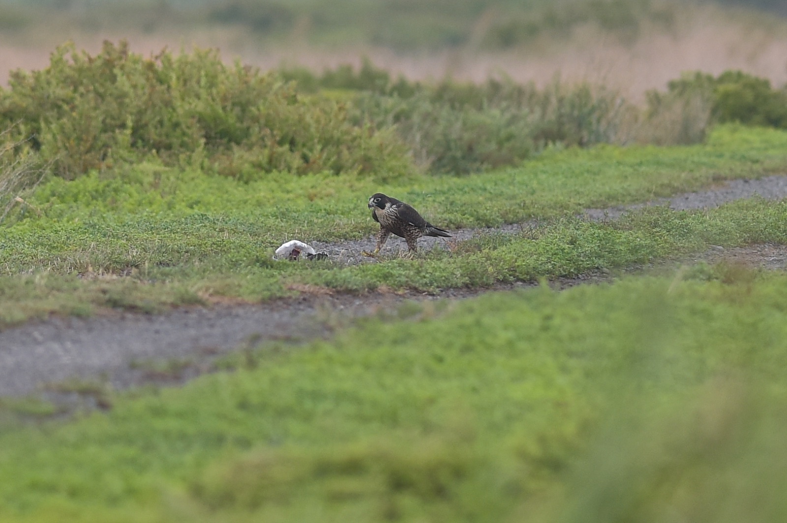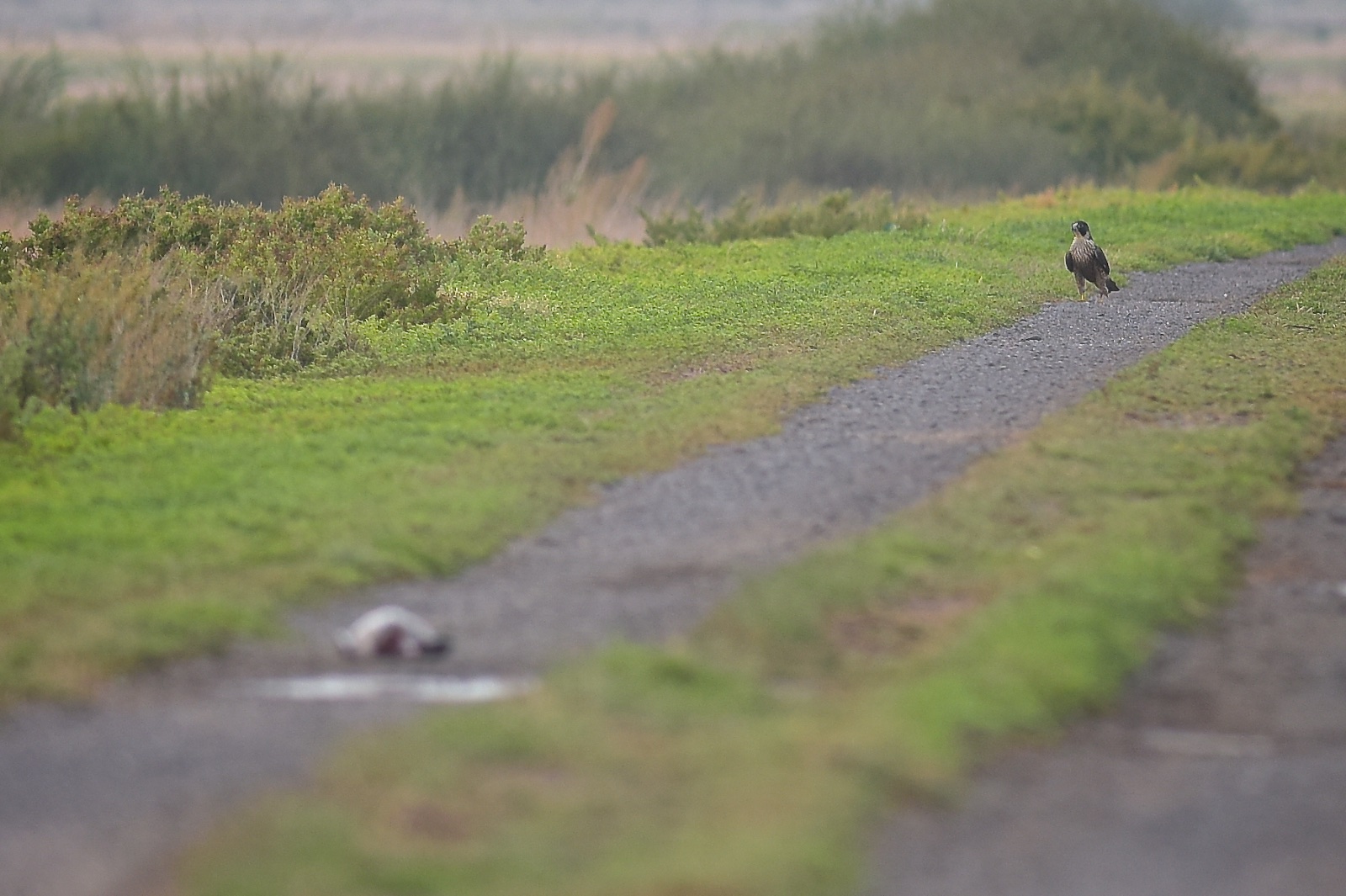 The duck is a heavy creature and the Falcon can’t get it airborne and must work it on the ground. Now, ordinarily, good luck would have put the prey down in a secluded spot. However in this case it was on the middle of the track we were travelling out along.