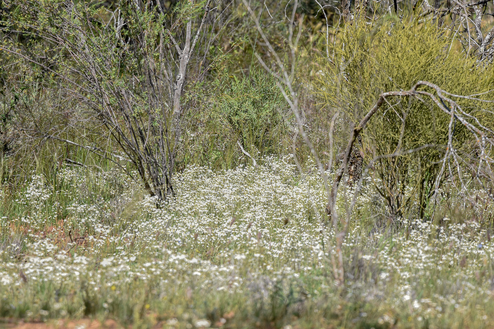 The park is in top condition. The recent rains have turned the usual red sand into a most glorious garden. Rich with both colour and variety. And off course the birds have taken full advantage of the opportunity. We found quite a number of Hooded Robins with young at various stages of development, and White-browed and Grey-crowned Babblers hard at work with young.