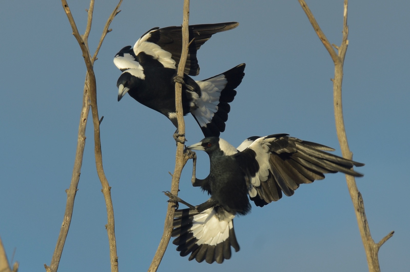 I think this Scarlet Robin and the Red-capped were in disagreement over territory.  The Scarlet being a much bigger bird had the height advantage.
