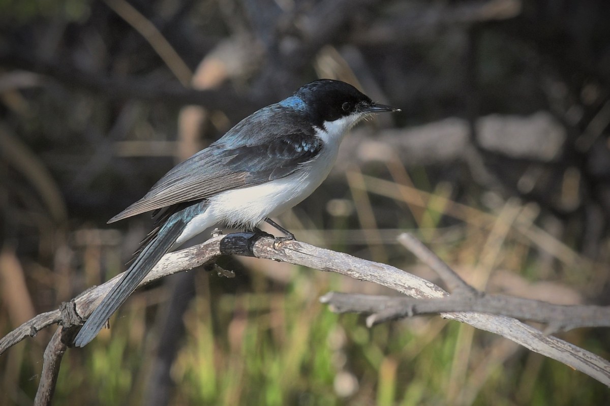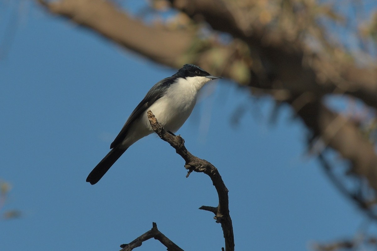 But, true to its “restless’ name, it hardly sat in one place long enough to grab focus.  And off course the challenge of exposure of a black and white bird against a variety of backdrops from midtone, to dark shadows and the brilliant grey of sunlit tree trunks.