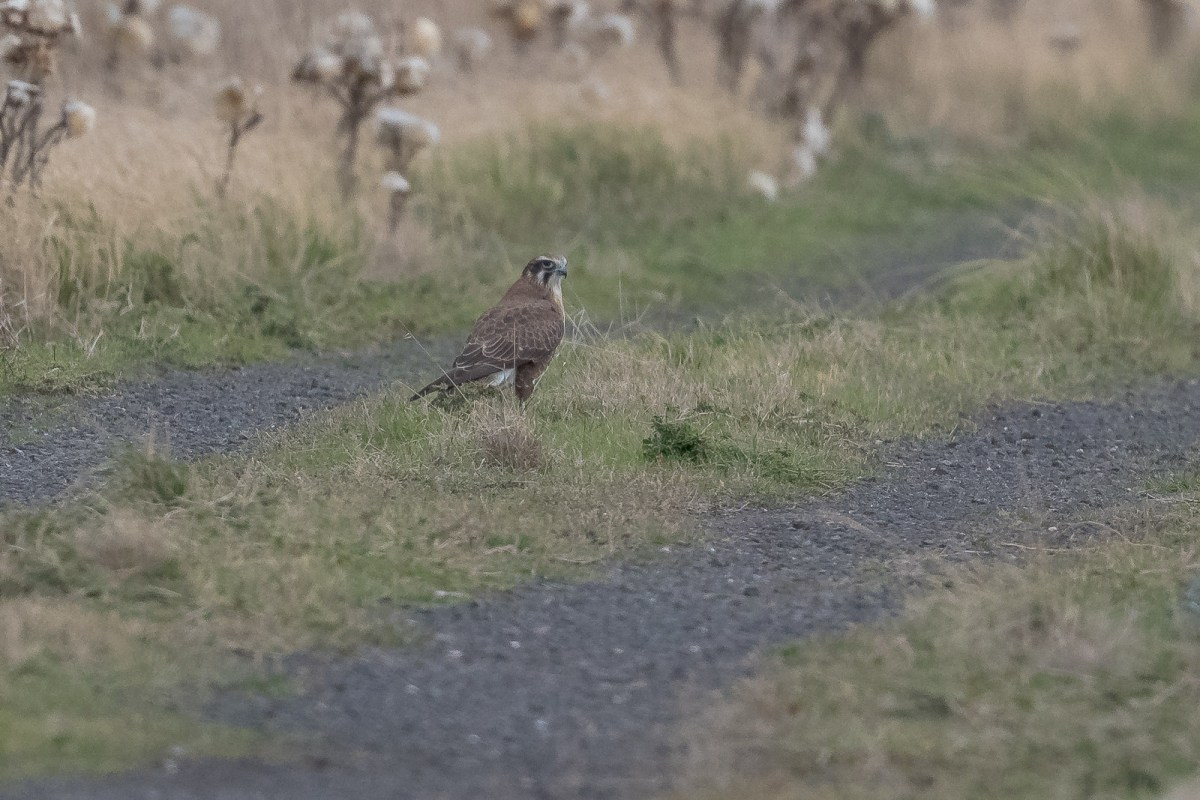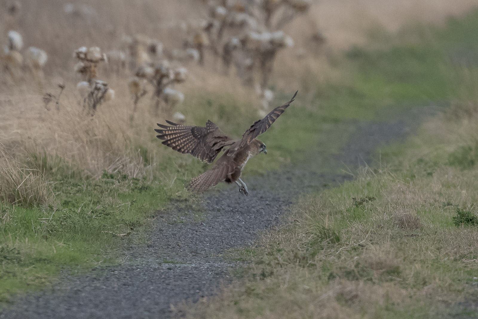 Found Arthur the Brown Falcon at work in the fields again. Every time he got airborne, the local Magpie squadron took him out, so he was contented to hunt mostly among the tall grasses and roadside.