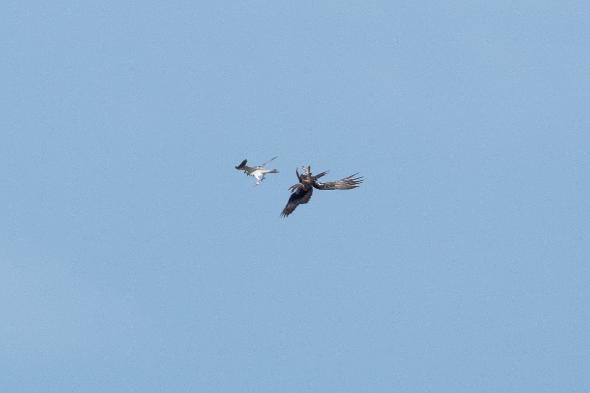 Looking up, I heard the familiar call of a Black-shouldered Kite with a mouse, and as we looked a Black Falcon swept in from no where and after a little evasion from the Kite, the Falcon secured the prize and took off with the erstwhile and very angry kite in hot pursuit, but to no avail. The Black is just that good in the air.