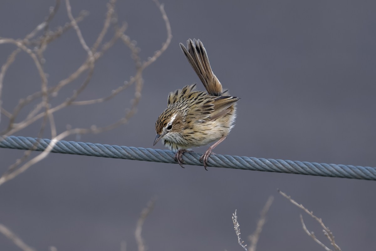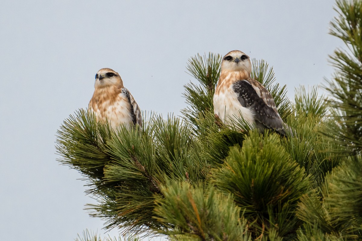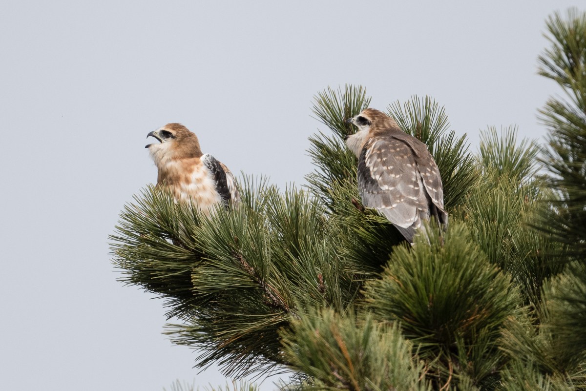 The young had indeed fledged, and one flew over us almost immediately and landed at the top of the a nearby pine tree, and stayed there the next couple of hours. I concluded later, that it was the one that had recently been fed, and its sibling was still waiting for “Couch Potato” to stretch his wings and bring in another mouse. The giveaway was the continual “sraaarcking” call. In the meantime it amused itself by climbing through the branches of the trees and jumping from one tree to another.