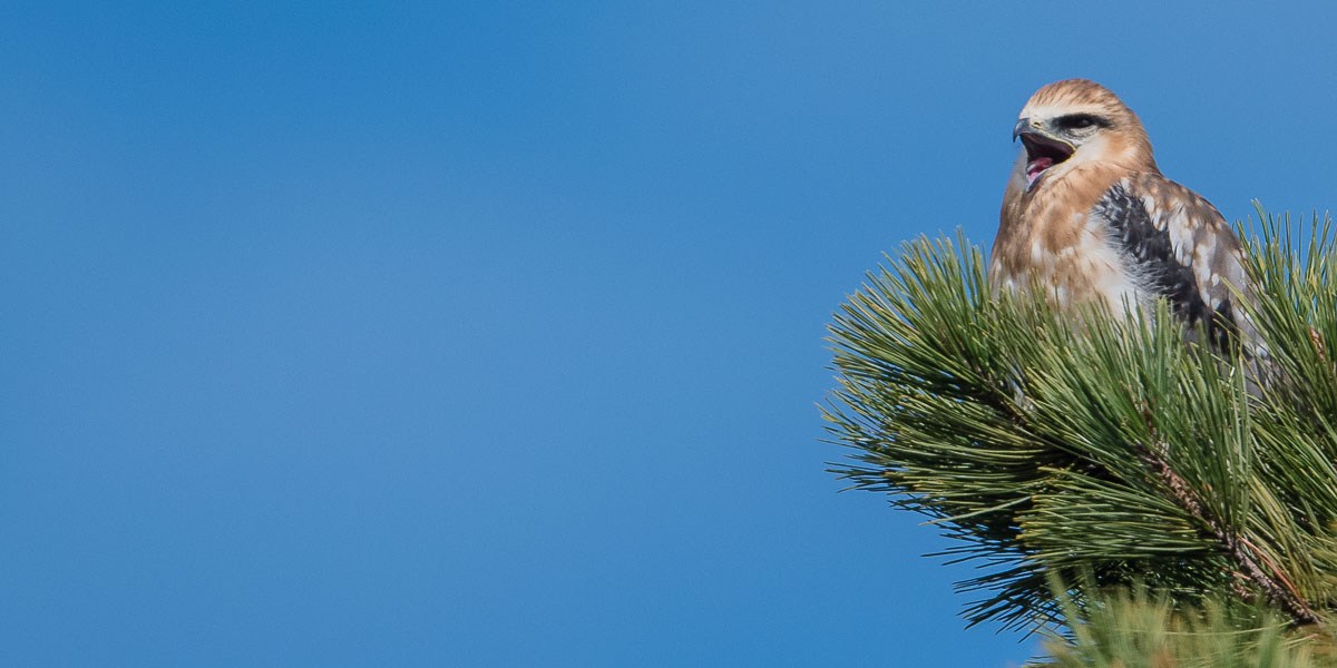 The young had indeed fledged, and one flew over us almost immediately and landed at the top of the a nearby pine tree, and stayed there the next couple of hours. I concluded later, that it was the one that had recently been fed, and its sibling was still waiting for “Couch Potato” to stretch his wings and bring in another mouse. The giveaway was the continual “sraaarcking” call. In the meantime it amused itself by climbing through the branches of the trees and jumping from one tree to another.
