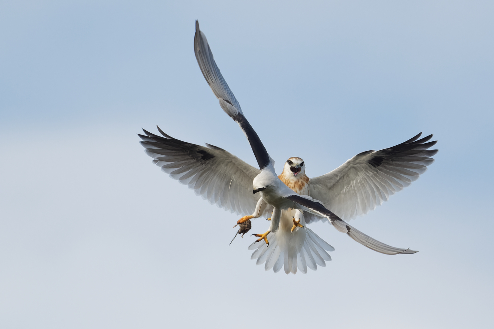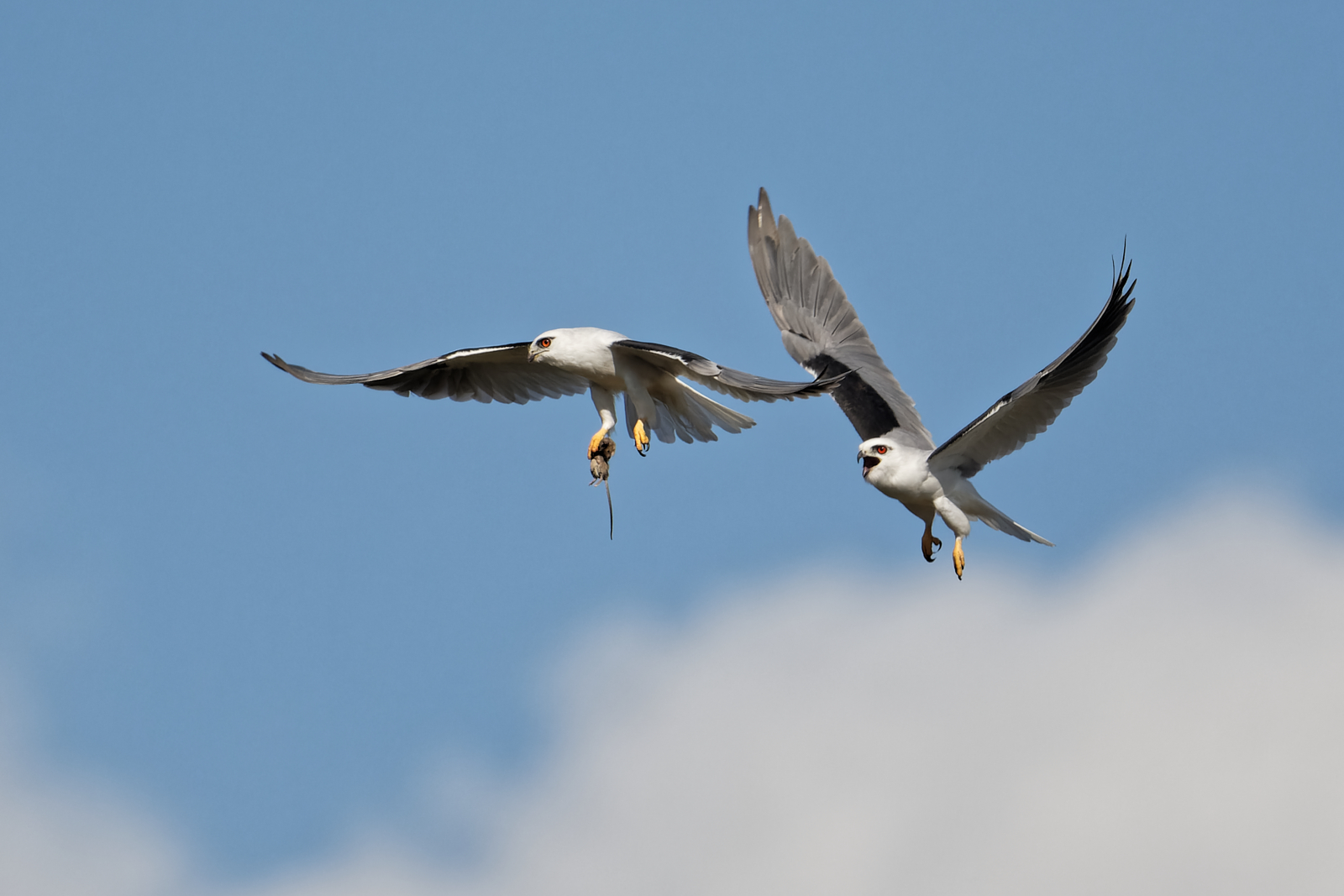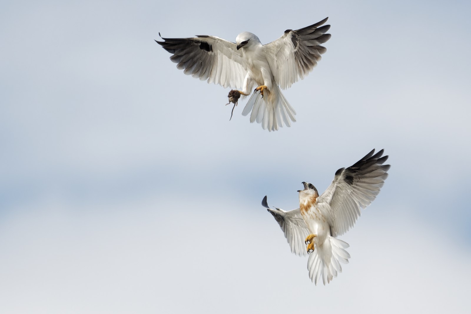 2. Dainty: Again he hangs midair, she lines up from underneath and plucks the mouse with her beak. She is practically motionless at the point of contact.