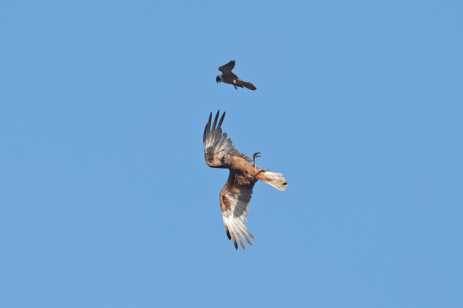 Unlike Peregrines, Hobbies seem to make much more shallow stoops, presumably they cannot really physically attack the much larger Kites, so a game of bobbing across the sky, with quick shallow dives on the intruder is probably to put it off the job in hand, and eventually drive it from the area.
