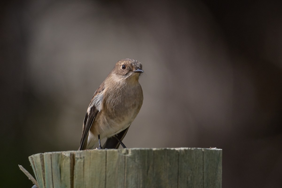 She jumped onto the post, and it struck me to move a little further along the fence and use a distant pine tree as a rich dark backdrop, and then I spotted the highlight of sky between the branches.