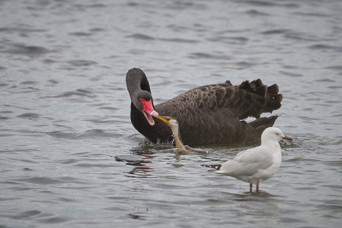 A few seconds later it did the same thing, and then a Little Pied Cormorant popped up out of the water along side it. The swan took a swing at the cormorant and it quickly submerged.