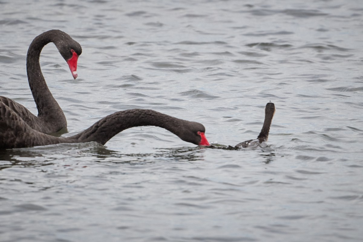 Eventually tiring of it all the cormorant swam off, while the pair of swans went back to ‘swanning about’.