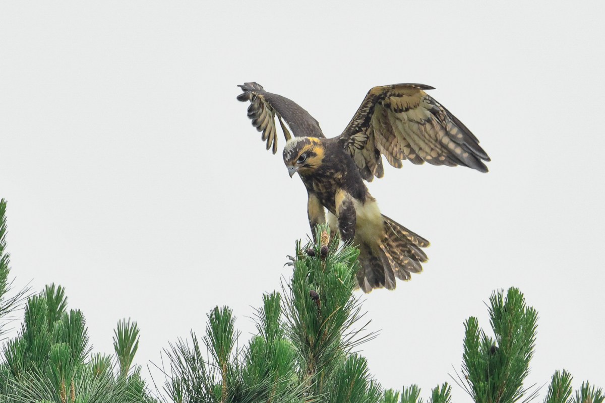 Rested and ready to hunt again, the male heads out. He is a much lighter marked bird.