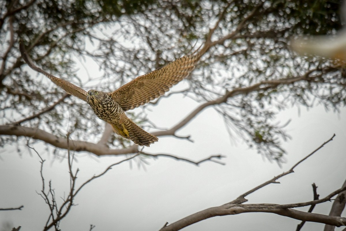 Let’s settle down for a small portrait session.What was that noise! One of the young birds is on the alert that something is happeningSuddenly, out of nowhere, and this shot is just after the shot above, the Collared Sparrowhawk barrelled through the treeline and put the young birds to wing. You can just see a tail disappearing at the top. The speed and stealth of the Sparrowhawk was so typical, and so impressive. That the Sparrowhawk is in focus is only because it now occupied where there kites had been sitting. Your erstwhile scribe was as surprised as could be when I reviewed the results and found one sharp frame.Looking a bit perplexed as to what just happened, each of the young seemed unsure how to respondDad turned up to try and protect the young, and one of them followed him around very closely. To add to the drama a Black Kite and its two Magpie Attendants, also flew through the area. The male is checking to see if they pose any threat to his charges. This one decided that if you were going to rest, then do so in the top of the tree among the leaves so a sneak attack would be less likely.