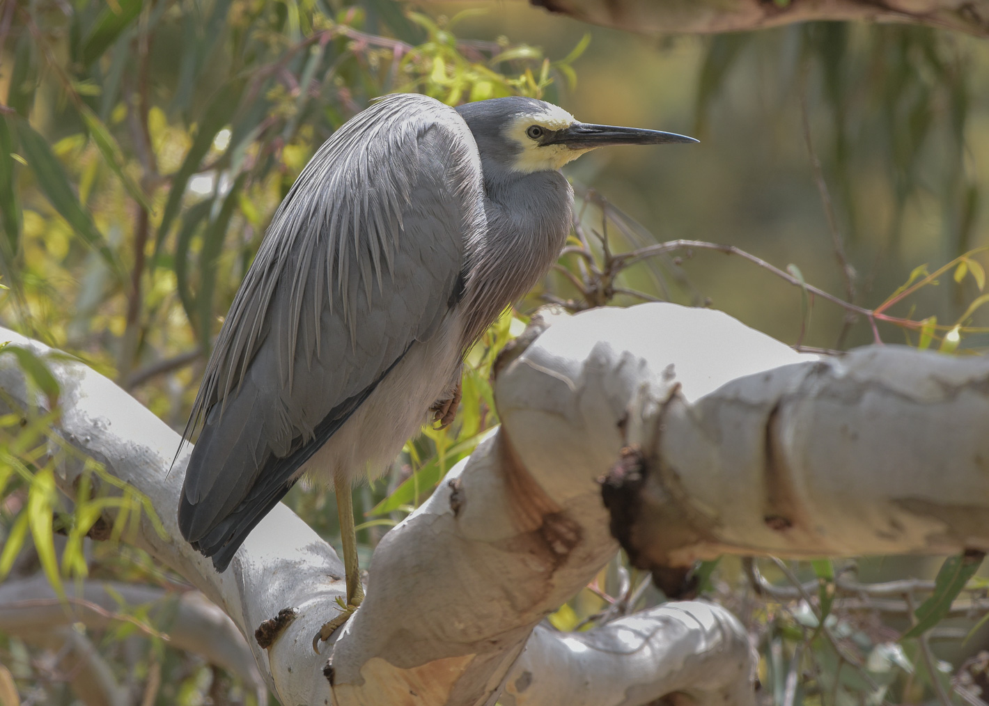 A large log shows how high the water was when it was running at full depth. Red Wattlebird. One of a number still feeding noisy youngCan’t seem to go anywhere without a clan of Rainbow Lorikeets turning up to put on a show.This White-faced Heron was looking surprisingly hunched up.There was much discussion between the pair of Red-rumps. But as she wasn’t interested in moving away from the nest hole, I guessed there were young inside.EE’s Spot of the Day. “Way down there on the Tree” Helpful when we are in a forest of trees that goes a long way way down there. Figured out eventually from a pair of helpful Willie Wagtails that were waiting for the Collared Sparrowhawk to move on. It did, and in a few minutes flew past taking someone home for dinner How strong are those pincers? The Sulphur-crested Cockatoo just sliced the tough seeds apart like scones. Want to see a Cockatoo rearranging the windowboxes on flats in the Melbourne CBD? See this ABC Article.We spotted this young Grey Shrike-thrush begging for food in someone’s garden. Had to shoot through the railing because of space limitations.Mum arrived with a big fat worm, but was immediately harassed by a squadron of White-plumed Honeyeaters, so… It flew to another branch and enjoyed the meal itself.Another great find. A Wagtail family. These young are a week or more out of the nest. The harassed parents are looking after four young from the clutch, so Wagtailville is very busy and noisy.
