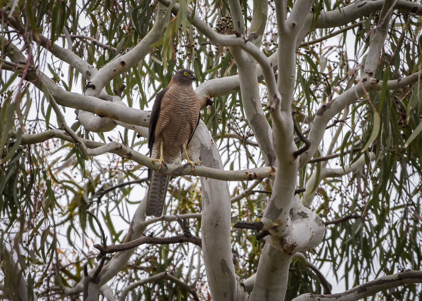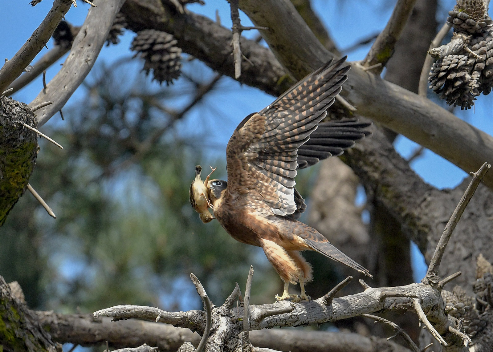 The weather has not been conducive to keeping tabs on the local Hobby Nursery. We have also the challenge of the location, as its quite a busy carpark, and Security offers its own challenges. Carparks are not public spaces. The second challege to in-flight photography is the trees are all very well established Sugar Gums, with a few Umbrella Pine, and all quite tall, and of course close together. So its hard to get an open shot of in-flight activity.