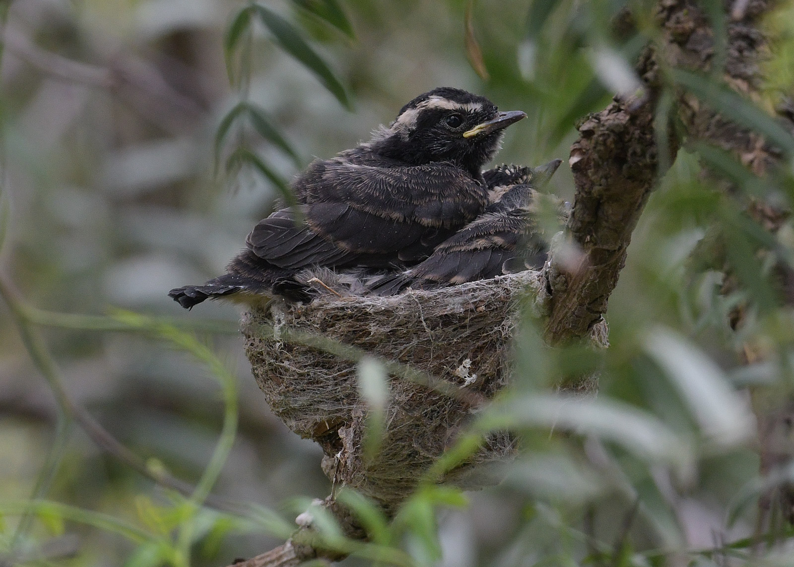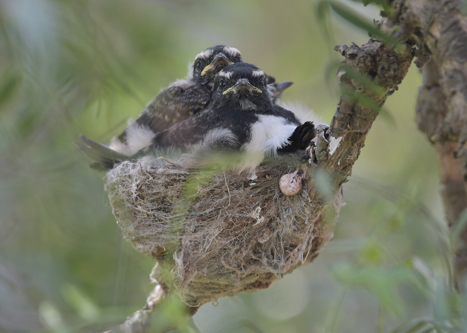 We found this pair well inside a small old Peppercorn tree. Took a while to work out as one flys in, the other flys out and it would fool many a casual observer.Little tiny mouths to feed. Not much more than 3 days old they have very long necks to get the best food. The Peppercorn fronds kept a safe fine veil over themJust a few days old, but already the nest space is at a premium. Everyone just sits very stillFive days later and they are well on the way to filling the nest.Tiny wings needs stretching and its means that your siblings have to put up with your need for space. The tiny wings are still in the sheaths as they begin to unfoldOne of the most amusing things is the tiny tail. While they quickly learn the Wagtail ‘wag’, the little feathers seem a bit inadequate for the job. Flight Day. When we passed by in the morning they were still huddling together, but the adults were much more conspicious and noisy than usual. The adults sat on branches outside the bush and offered encouraging wingflap signs to the young.