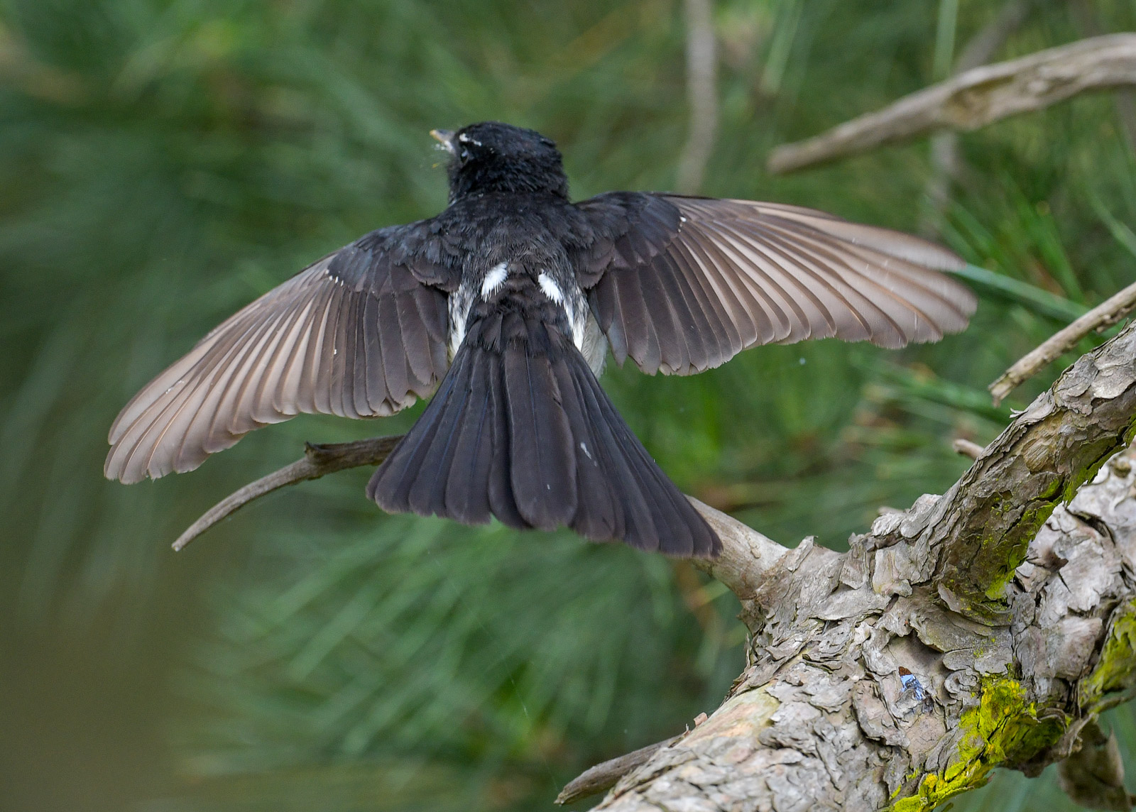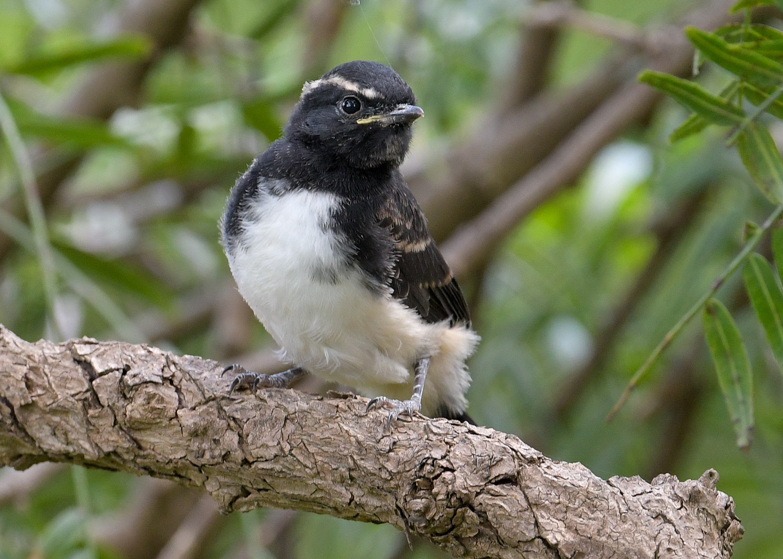 The weather here was not kind to the first clutches of Willie Wagtails. Those birds that started early ran into extreme conditions and as the nest is mostly spider-web and at best minimally attached to the branch, rain and high wind inevitabley took their toll. Some Willies brave it and have nests on open branches, while others adopt a more sheltered approach. Some will work on just a branch, while others go to the extreme of working on a branch junction and get the support of several branches, and even a vertical one which does give them extra support as it seems easier to bind the spiderweb tightly.