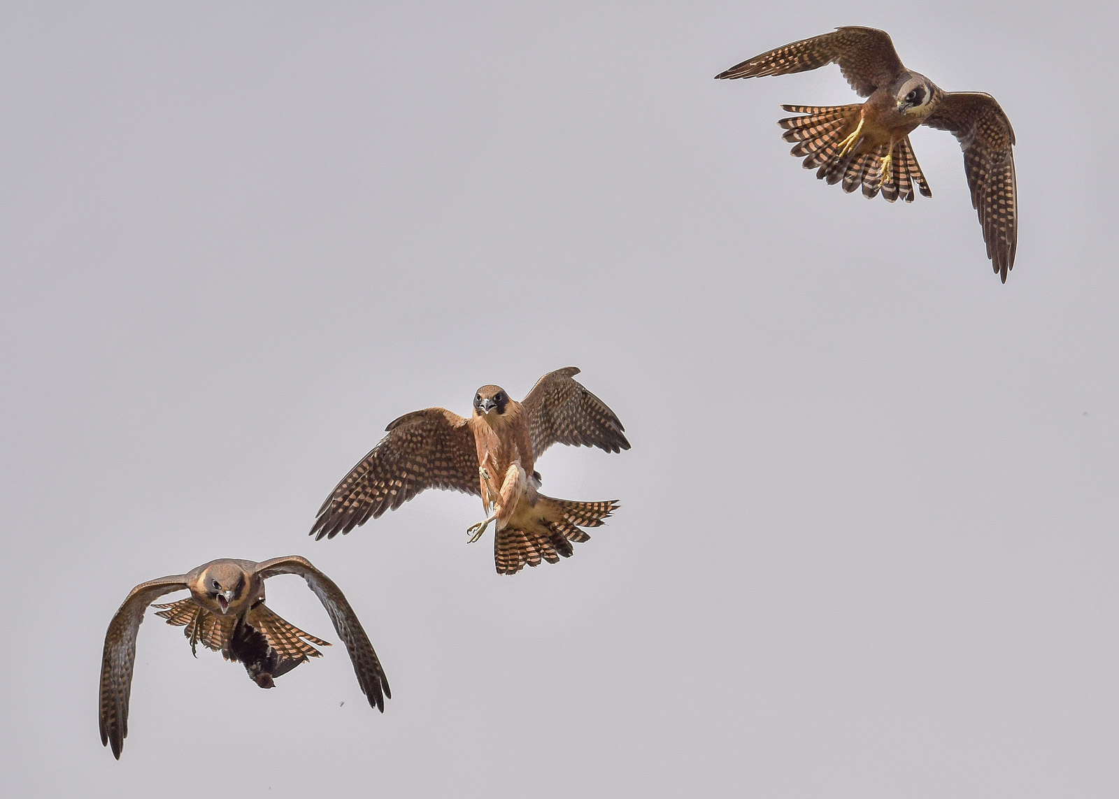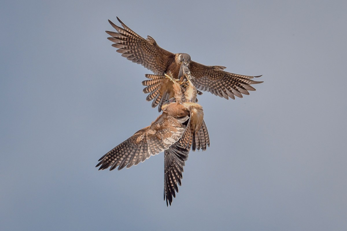 Dad arrives with a breakfast offering. Unlike Black-shouldered Kites, he doesn’t seem to have the ability to hover. Rather he pulls up in a climb and then for a few seconds holds station before beginning to drop. Hold on. I’m comin’Me tooHard to see in these shots, but one of them is quite a bit larger than the other. So I’m tipping it’s a male and a female.I’m also sure everybody knows who’s turn it is for the food. I don’t think its a case of first in.I think this might be my Nat Geo Shot. Dropping away, Needing to find a suitable perch to hold the prey while it eats. That might work. Which leaves the other one to hone up its flying skills. They have already learned to take dragonflies in the air. A great look at the outstretch as it takes offGraining speed and heightDad arrives with a new meal. This time he takes the safe approach and delivers onto a branchAll secure and away