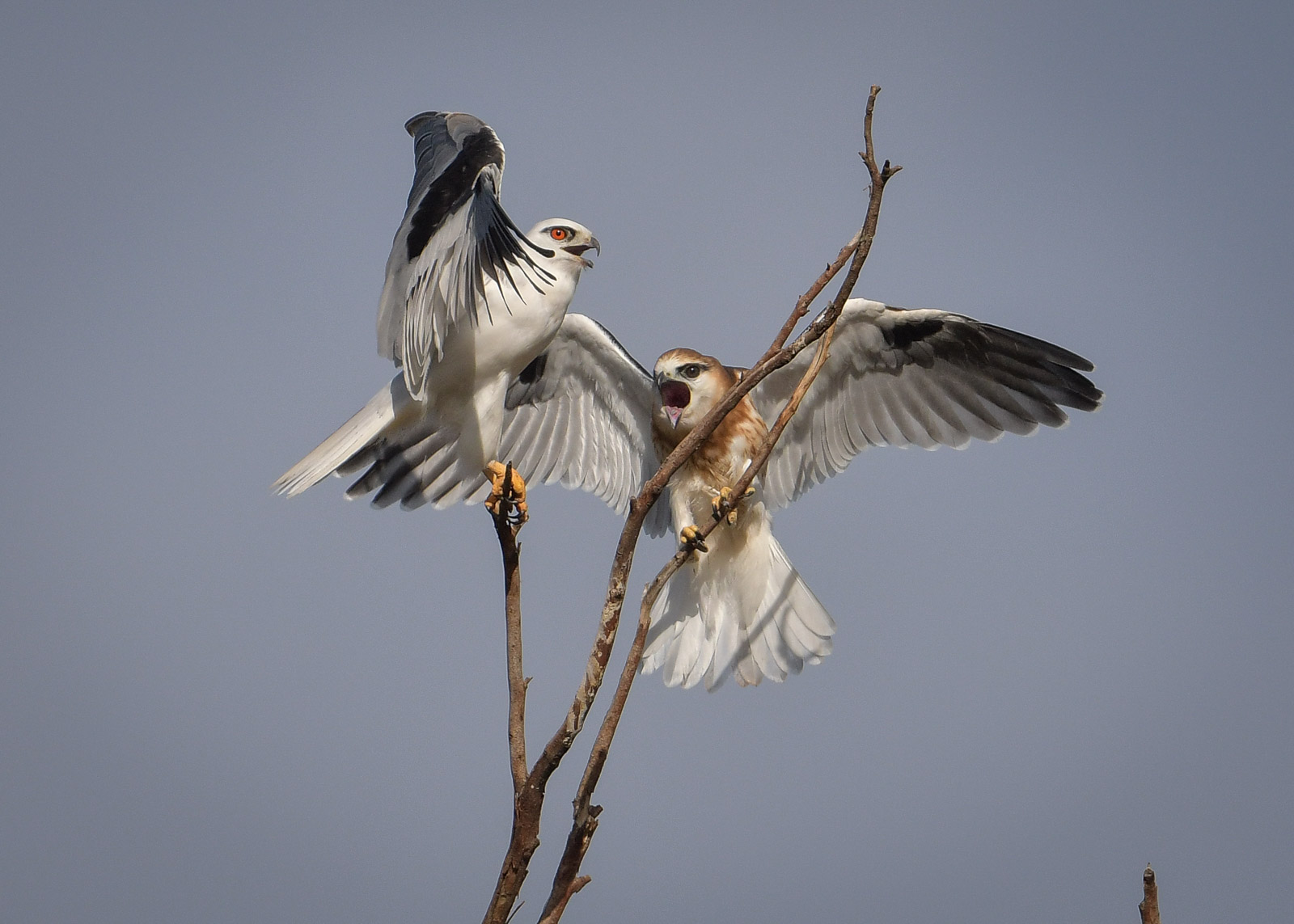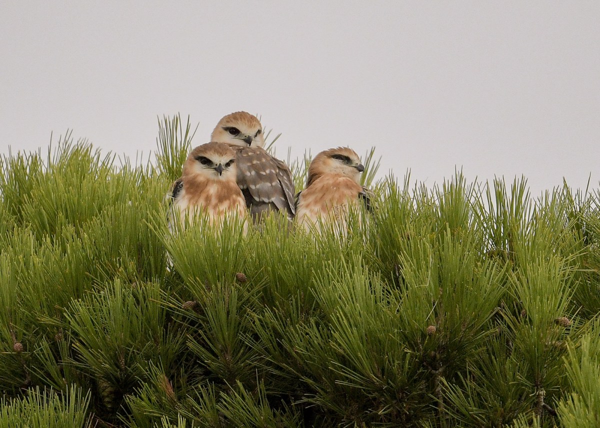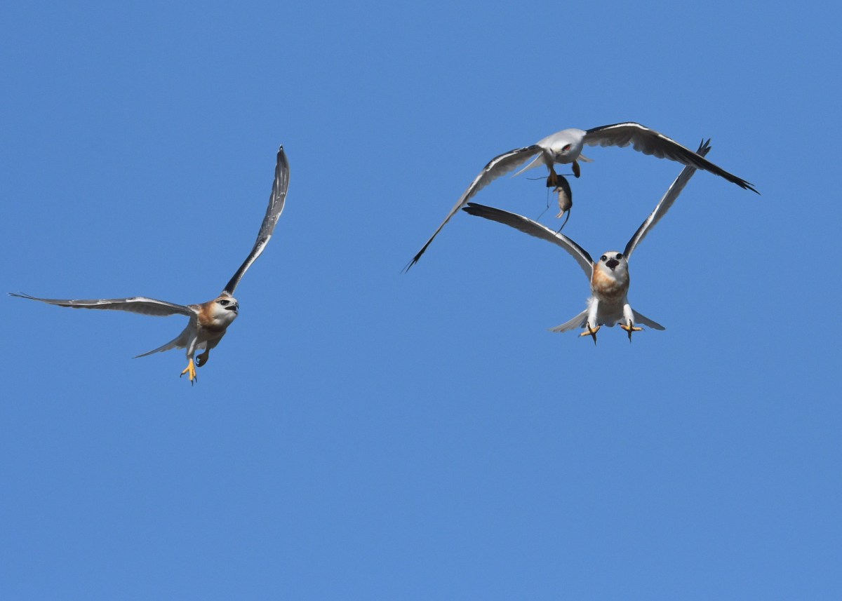 After a month of sitting on her eggs and another 3-4 weeks of feeding the young, Mum was finally ready to put them on display. At first we thought there might only be two, but eventually a third little head made itself visible. Perhaps one of the eggs was late hatching as it seemed one was always behind the other two in gaining the skillsOnce they were out and about, Mum went off for a rest and Dad took to raising and feeding them. They were very vocal in expressing their needs Not sure which day they flew, but one morning we arrived to find them out and about. Those first few days are a bit awkward in the air.Landing is always a traumatic event for the first few daysRule #5 In the Black-shouldered Kite Manual. Don’t harass Dad to go and catch a mouseTime to meet the friendly neighbourhood watchOne of the last skills to learn is aerial transfer of food. They always seem to be willing to participate in this activity. The one thing I’ve noted is that he already knows whose turn it is to take the mouse and will avoid the attacks of the others to be sure the right one gets the offering.