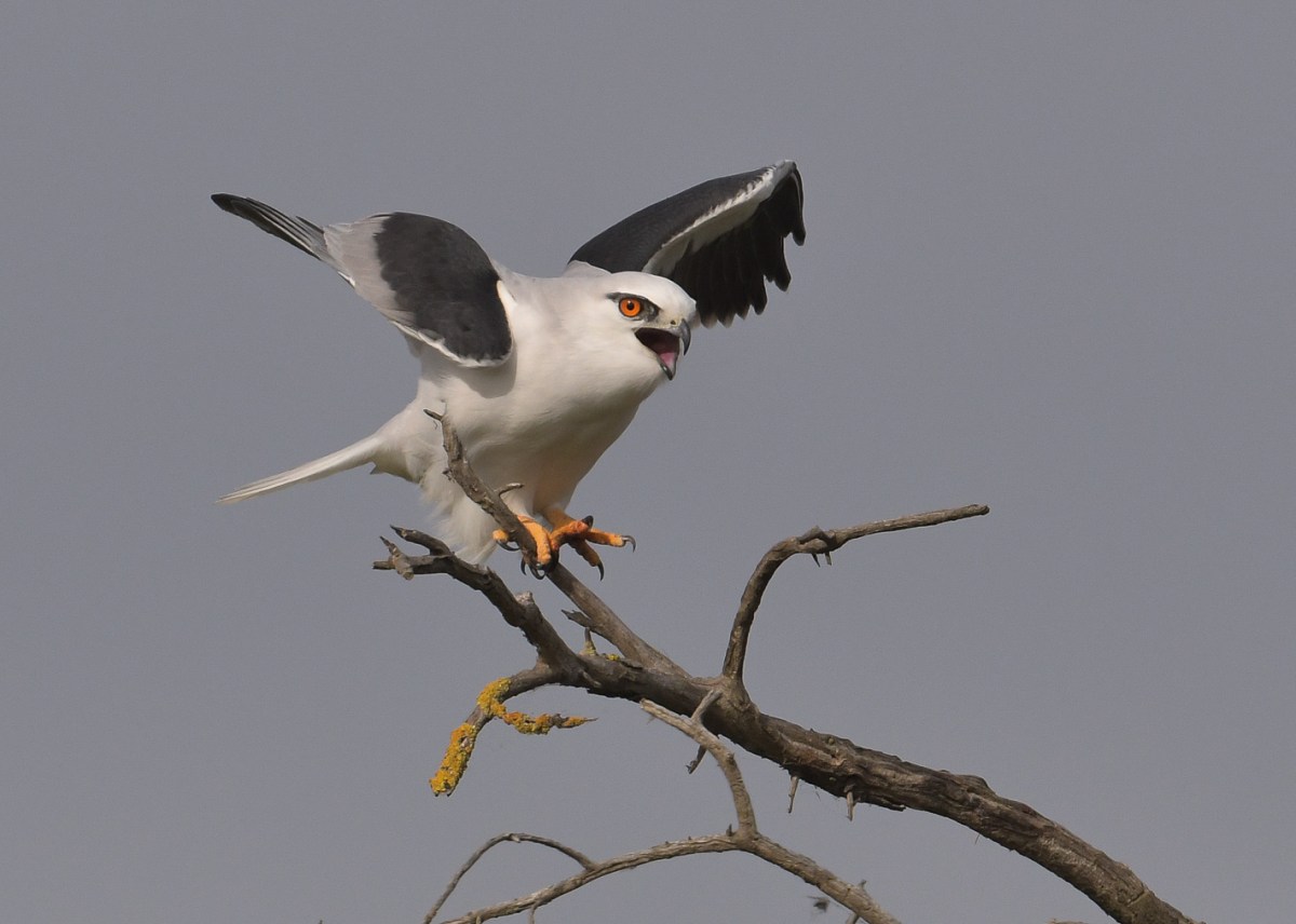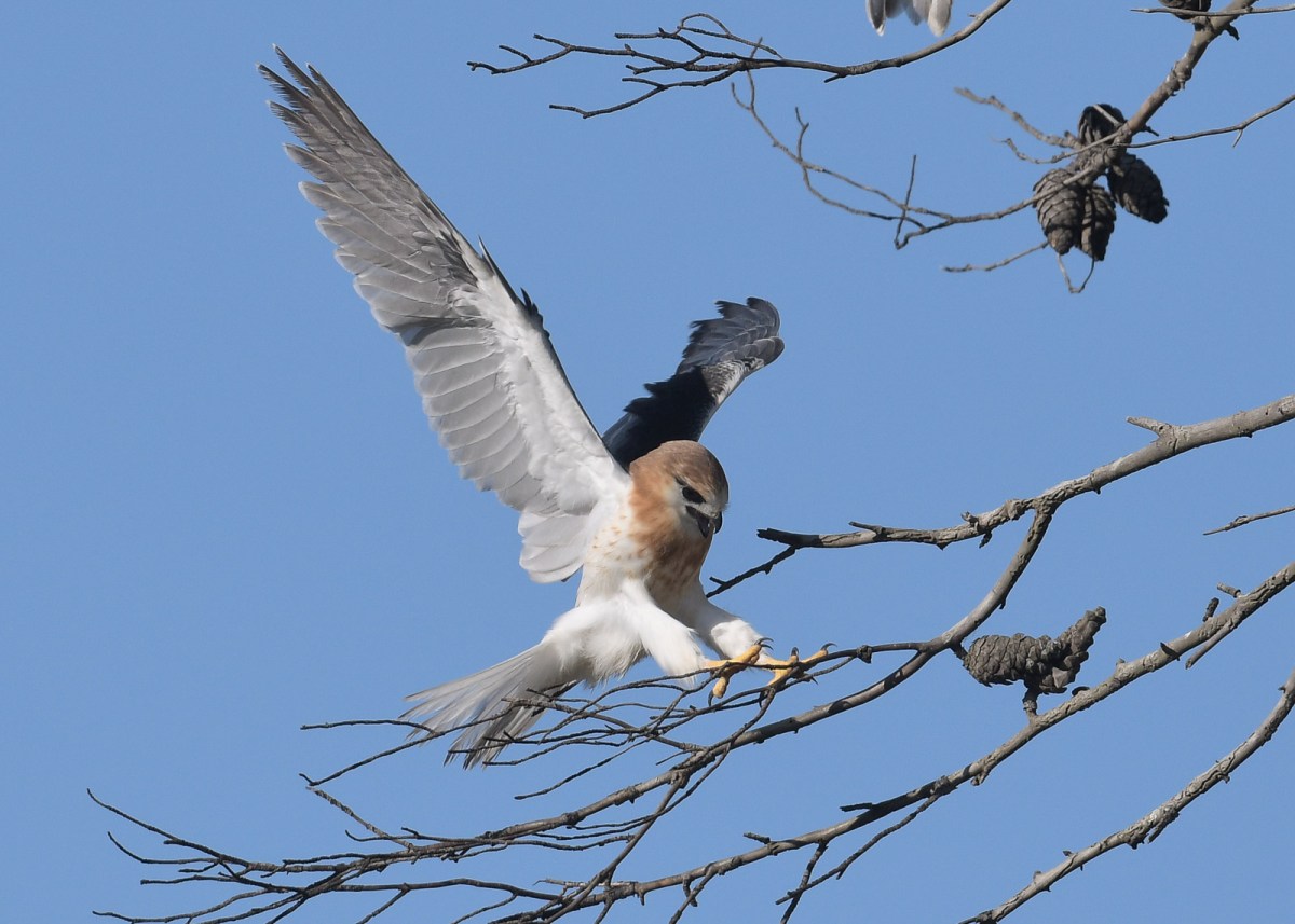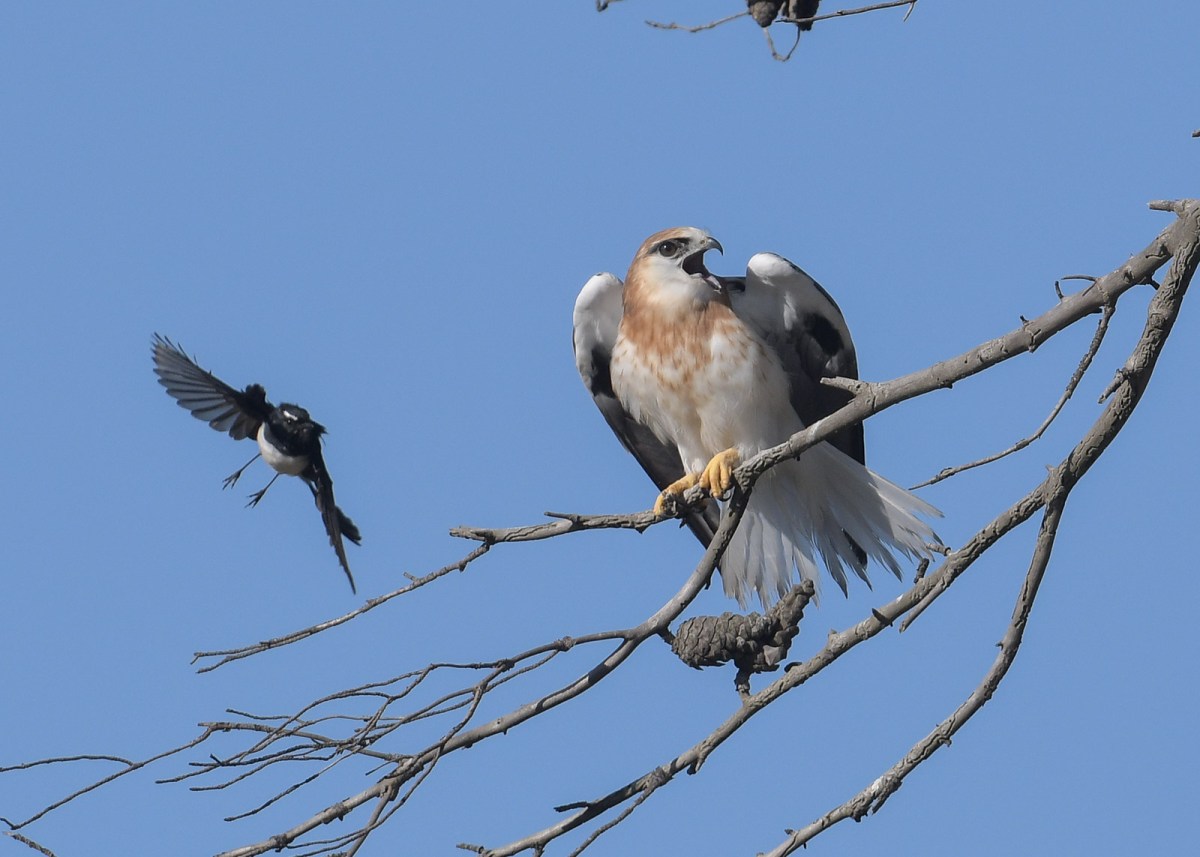 After a month of sitting on her eggs and another 3-4 weeks of feeding the young, Mum was finally ready to put them on display. At first we thought there might only be two, but eventually a third little head made itself visible. Perhaps one of the eggs was late hatching as it seemed one was always behind the other two in gaining the skillsOnce they were out and about, Mum went off for a rest and Dad took to raising and feeding them. They were very vocal in expressing their needs Not sure which day they flew, but one morning we arrived to find them out and about. Those first few days are a bit awkward in the air.Landing is always a traumatic event for the first few daysRule #5 In the Black-shouldered Kite Manual. Don’t harass Dad to go and catch a mouseTime to meet the friendly neighbourhood watchOne of the last skills to learn is aerial transfer of food. They always seem to be willing to participate in this activity. The one thing I’ve noted is that he already knows whose turn it is to take the mouse and will avoid the attacks of the others to be sure the right one gets the offering.