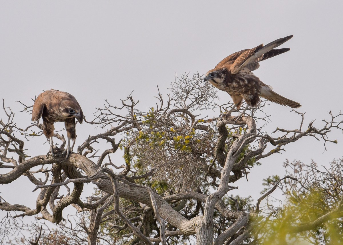 Here the male has just arrived to relieve the female for awhile.Nesting hasn’t blunted her hunting skillsDon’t mess with Mamma. She is unhappy about the Black Kite attention on the treelineMore Kestrel hunting. I missed the catch of this one. A pair of Brown Falcons, they are not ready to mate, but are doing their best to keep the pair-bond alive and bright.
