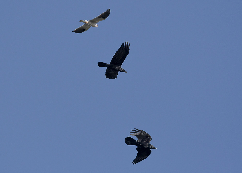 She is not having anyone put their nest in any proximity to her chosen site so a battle royal was in progress. The nifty little kite had two advantages, she can soar without using any energy—the ravens have to keep a constant wing -beat to stay up. And she has some speed advantage stooping from on high. The ravens have two advantages. Sheer numbers. There were about 12-15, and sheer cunning. While they allowed the kite to attack one or two, the others would group up for a sneak attack while she was distracted. After about 10 minutes, it all calmed down as the ravens needed to land and refresh.