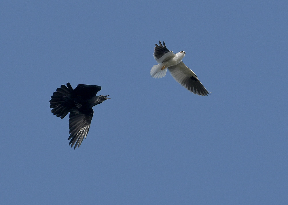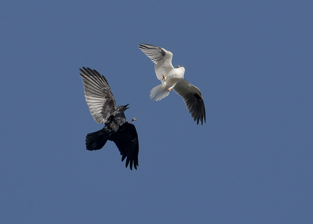 Let Battle BeginThe little Kite did, early on, get harassedHer abilty to stoop from on high meant she could keep them moving along, herding them away from her nesting areaSpeed comes to the rescueBut she could also be ambushed by one of the many support groupWhen it was all over, Mike came in unconcerned and delivering a meal.