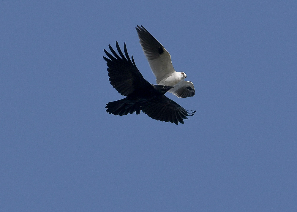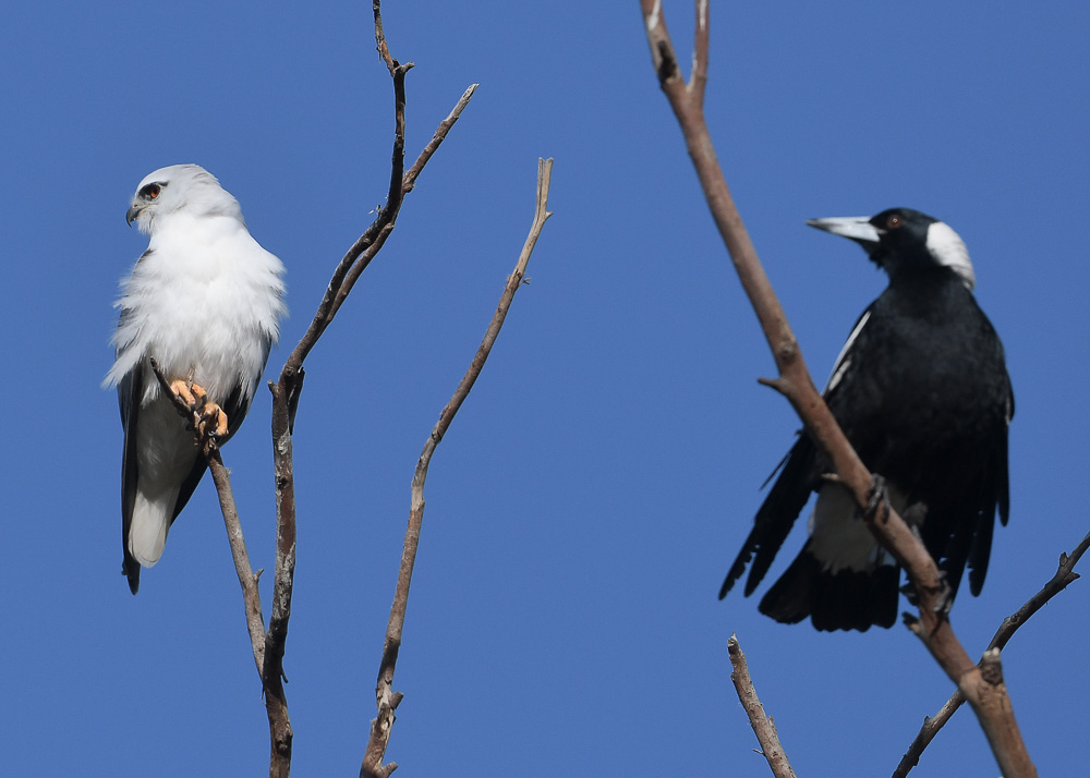 We had on a chance stopped by to see if infact Madeline the Black-shouldered Kite had any prospects of a full nest. Whatever is going on is worth defending as she cleared out a murder of Ravens, a lone Black-faced Cuckooshrike, the two Falcons, Cassia, of Cinnamon and Alistair, and confronted the home team neighborhood watch Magpies.