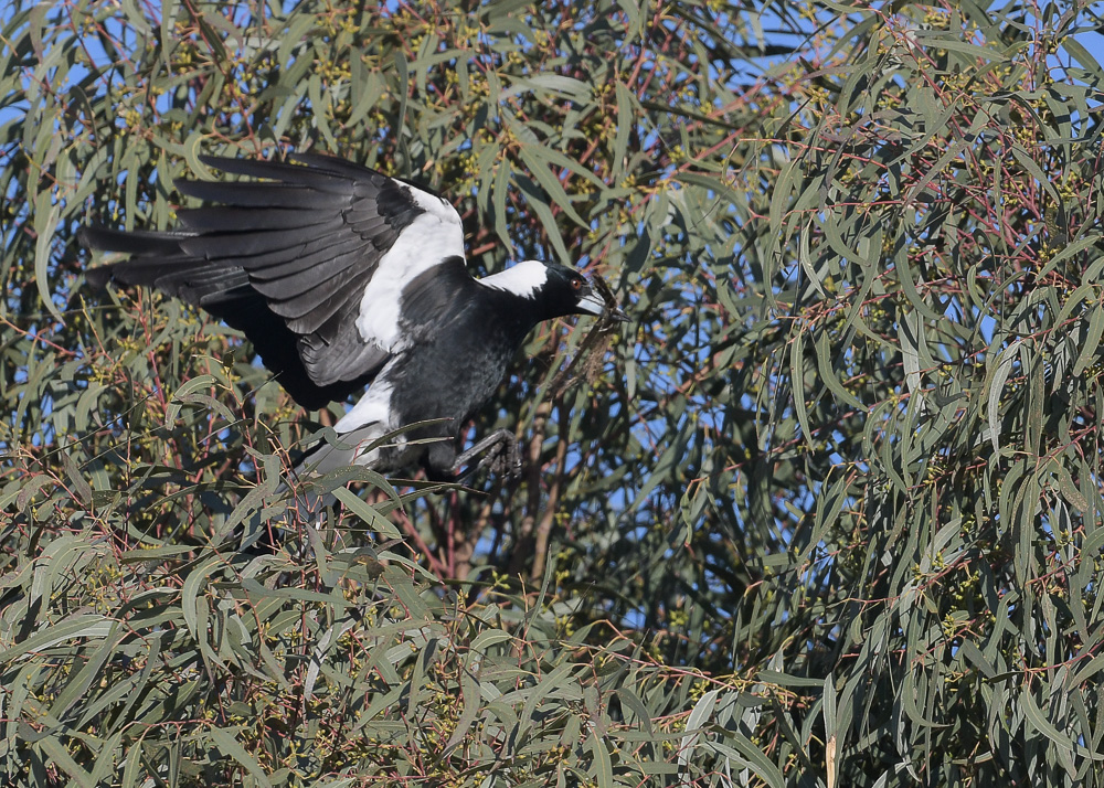 At least two loud exclamations from the D’s “There’s a New Nest Going in Up There”. And we all looked. Sure enough a lot of twitching and shaking in the leaves, and the resident Austalian Magpie was hard at work.