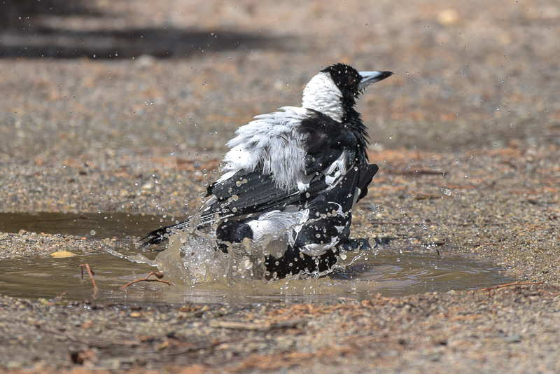 Love your series of Magpies puddle bathing David. They are such clean birds, always looking their immaculate best. However, after all that rain you would think they had enough drenching, but the process does refresh and remove lice and old feathers I guess, and may be a lot of pleasurable fun. Love that fluffy juvenile, so cute. Yes, it is another reminder of the value and pleasure we can have from birds bathing and drinking by simply adding the humble birdbath to our garden setting.