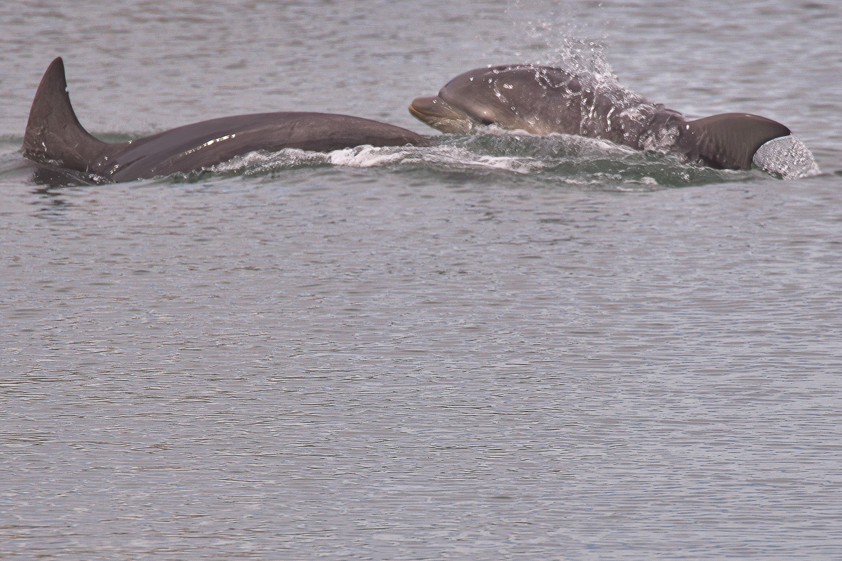 The pod, at least two young and adults and two or three other adults, were Bottlenose Dolphins (Tursiops truncatus)