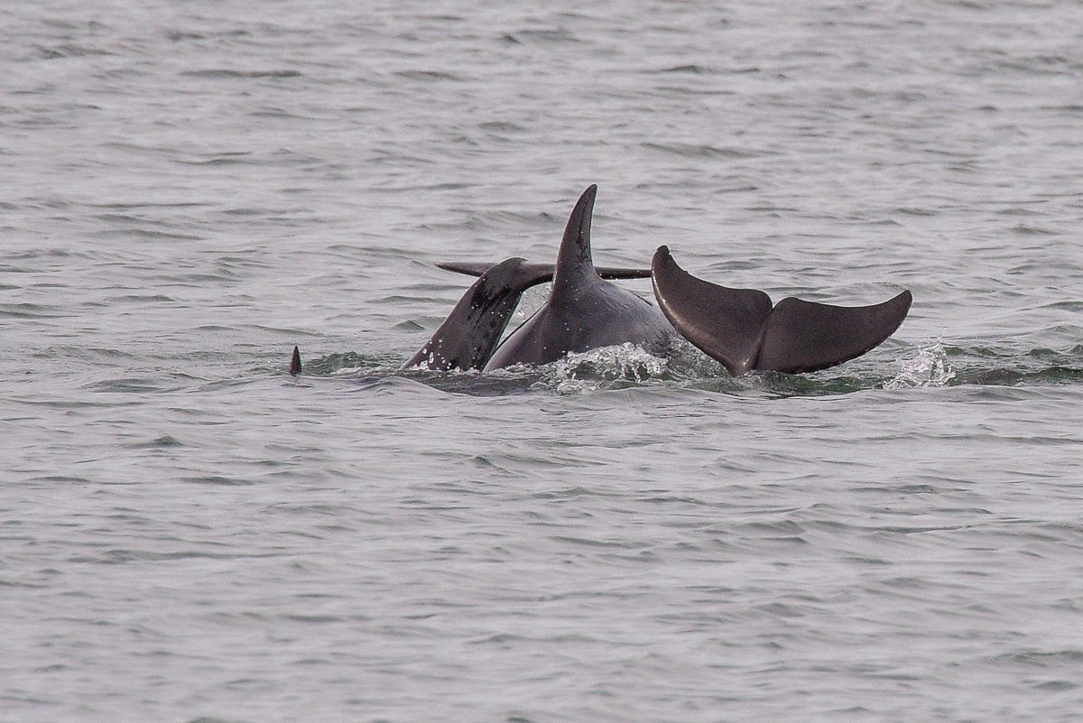 When suddenly, and certainly, to all watching, a huge surprise, some grey shapes rolled out of the water in the harbour and made their way among the boats.