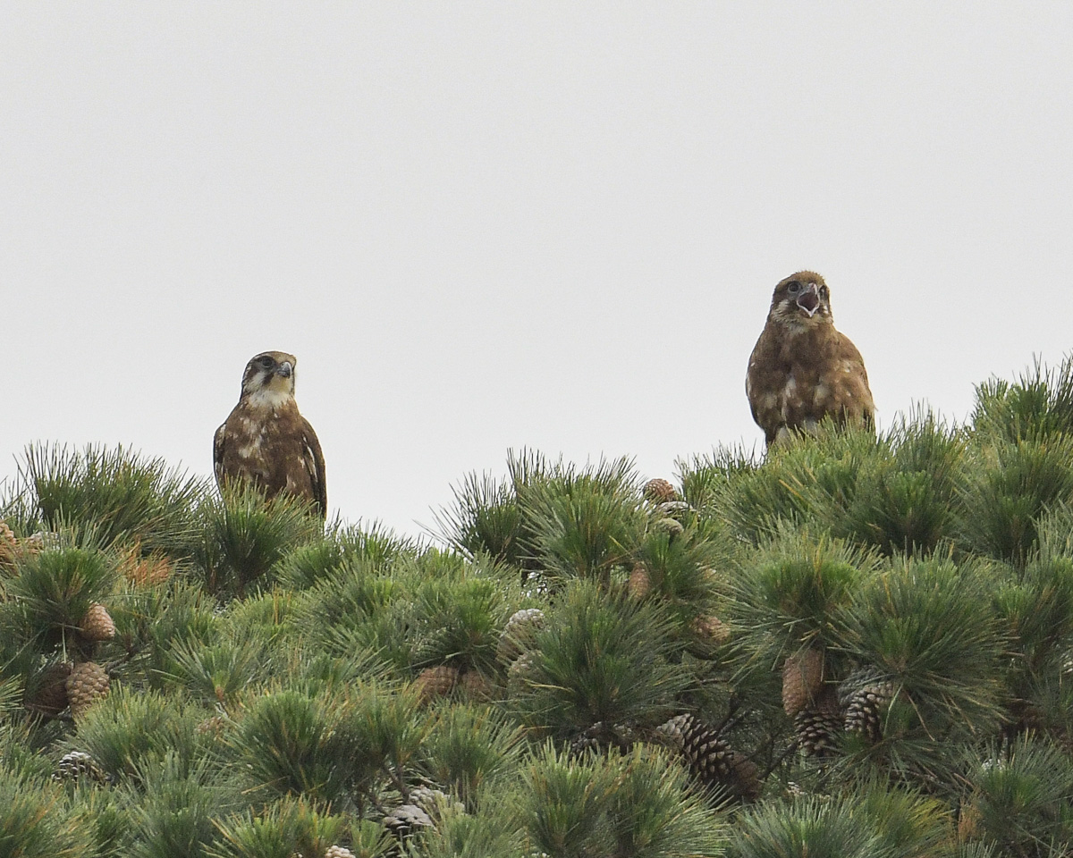 One morning I found them sitting together on top of an “umbrella pine”- or parasol pine. A little guessective work and I concluded that he had just provided a meal, And she flew, off behind some trees and out of sight. 😦