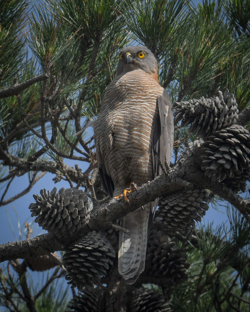 Suitably equipped with camera and thermos of Earl of Grey’s finest I sat down under a tree to wait. Got distracted badly by a local Collared Sparrowhawk that had also set up nest in the area—but that is another story. Ticky-tocky ticky tocky, time passes. Suddenly she is on top of a tree about 300m down the line. And then off in the far distance the male calling as he comes in. Another snake. She departed to a tree to feed, and again disappeared, but I was getting closer.