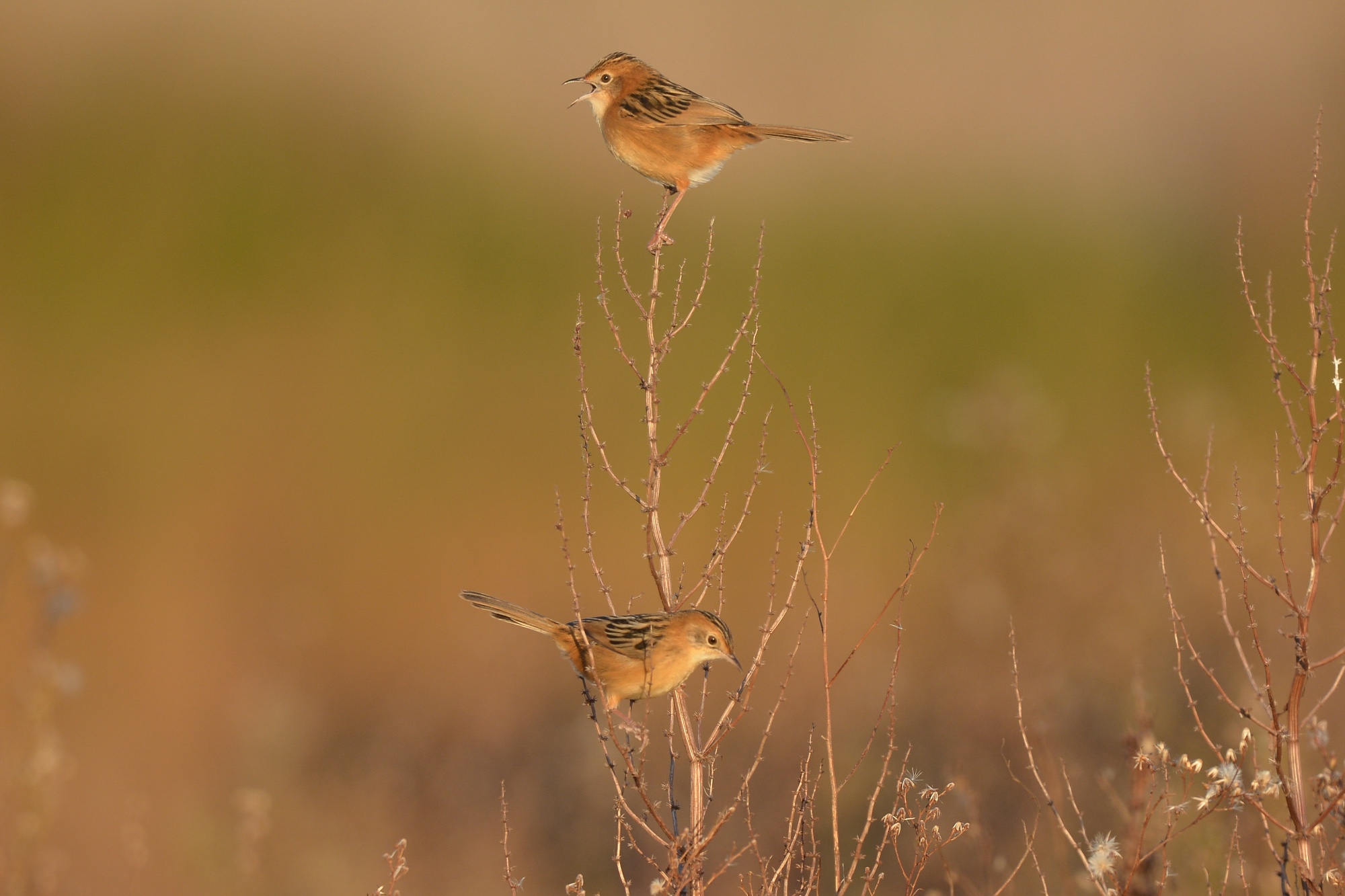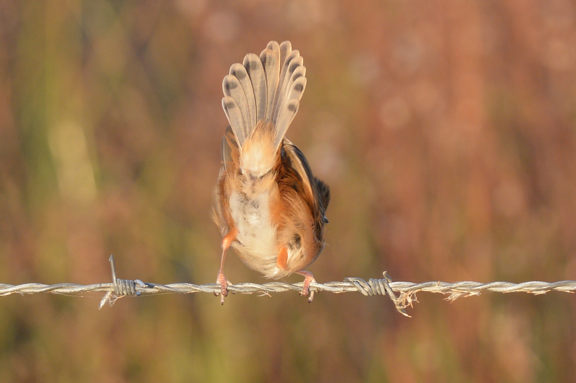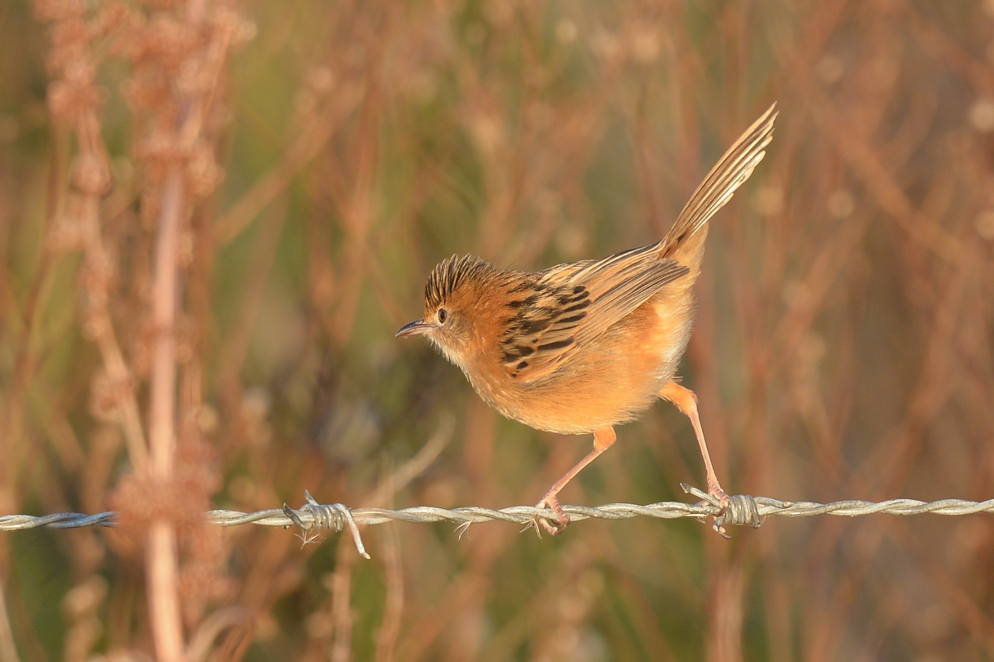 Lot of noise on the fence line just off the road. A small family of Golden-headed Cisticolas were intent on something.
