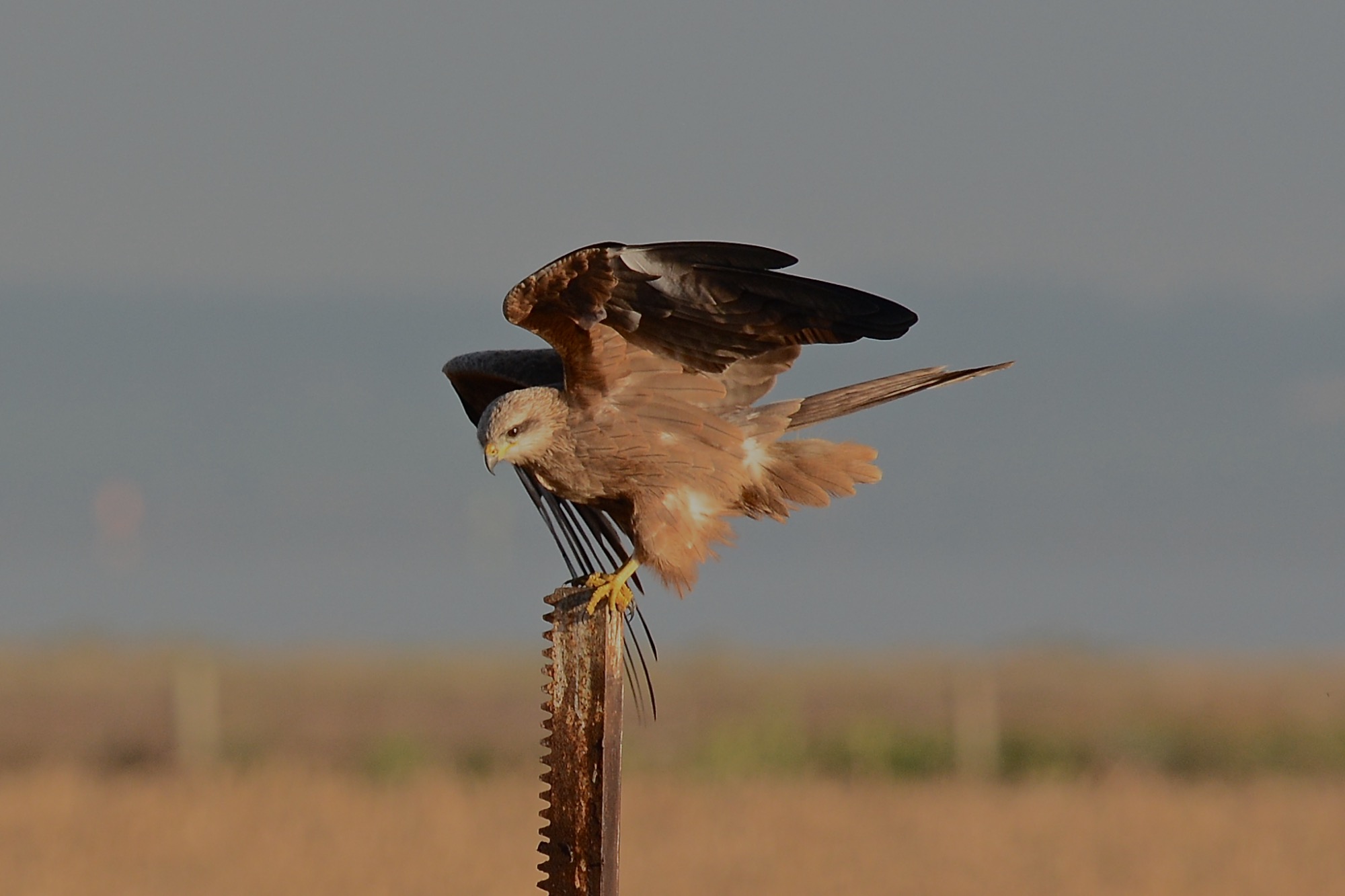 She caught a mouse. Swung over the paddock, not to the busy side, too dangerous to run the gauntlet of Flacons, Black, Whistling Kites and Swamp Harriers and scooted low down toward the fence line near us. Perhaps she had intended the post near the car, it certainly seemed that way from her flight path, but at the last moment, she swung right and landed about two posts down from us. Cameras out, insert shutter noises here.