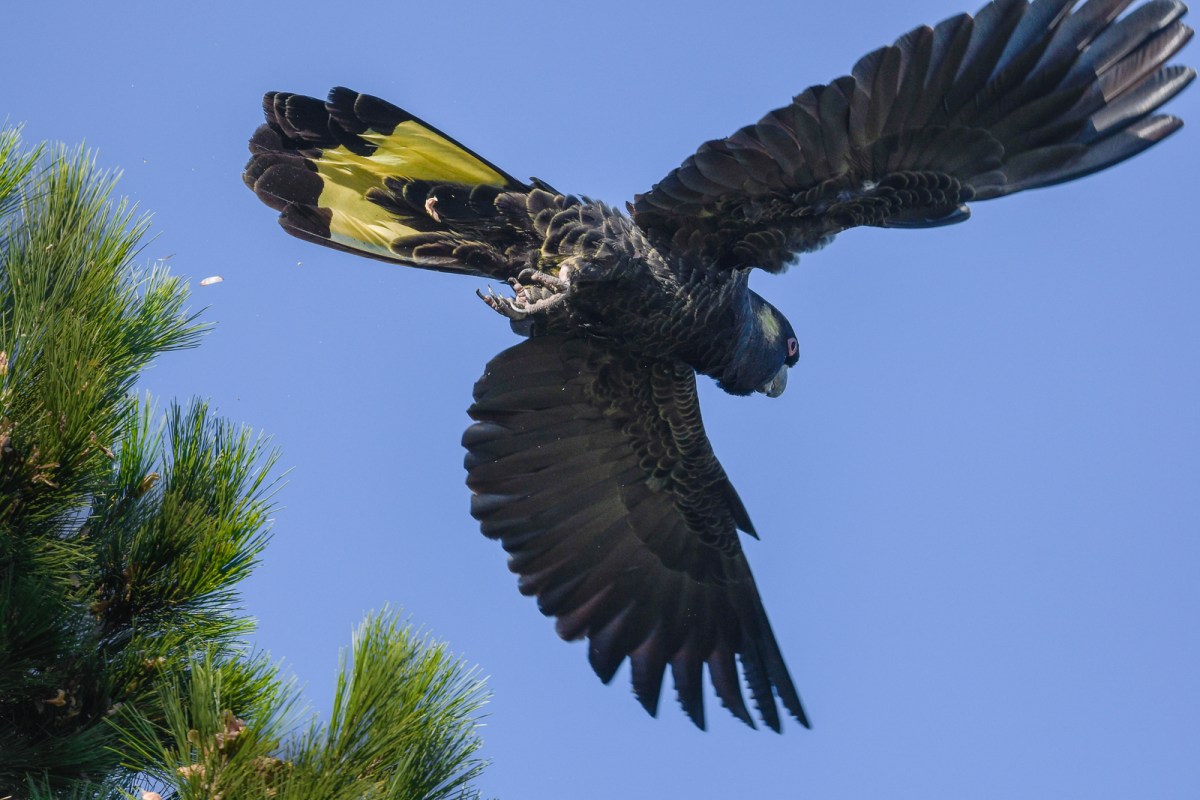 Next the call of Yellow-tailed Black Cockatoos rang across the frosty grass, and there on the other side of the paddock we say around 6-8 descend on the large pines. To be followed in quick succession by a second group of more than 20, and then another smaller mob of about 10. By the time we’d arrived close up, they were well in to their feast of the young cones in what can only be described as an open area dining area.