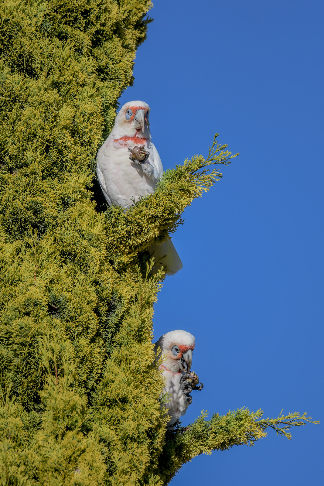 The roof of the colorbond garden shed rang with the disposed seed pods, must have been enough to wake up the inhabitants. The Long-bills made quick work of the pine nuts and there was much cackling and calling, perhaps discussing the merits of each nut?