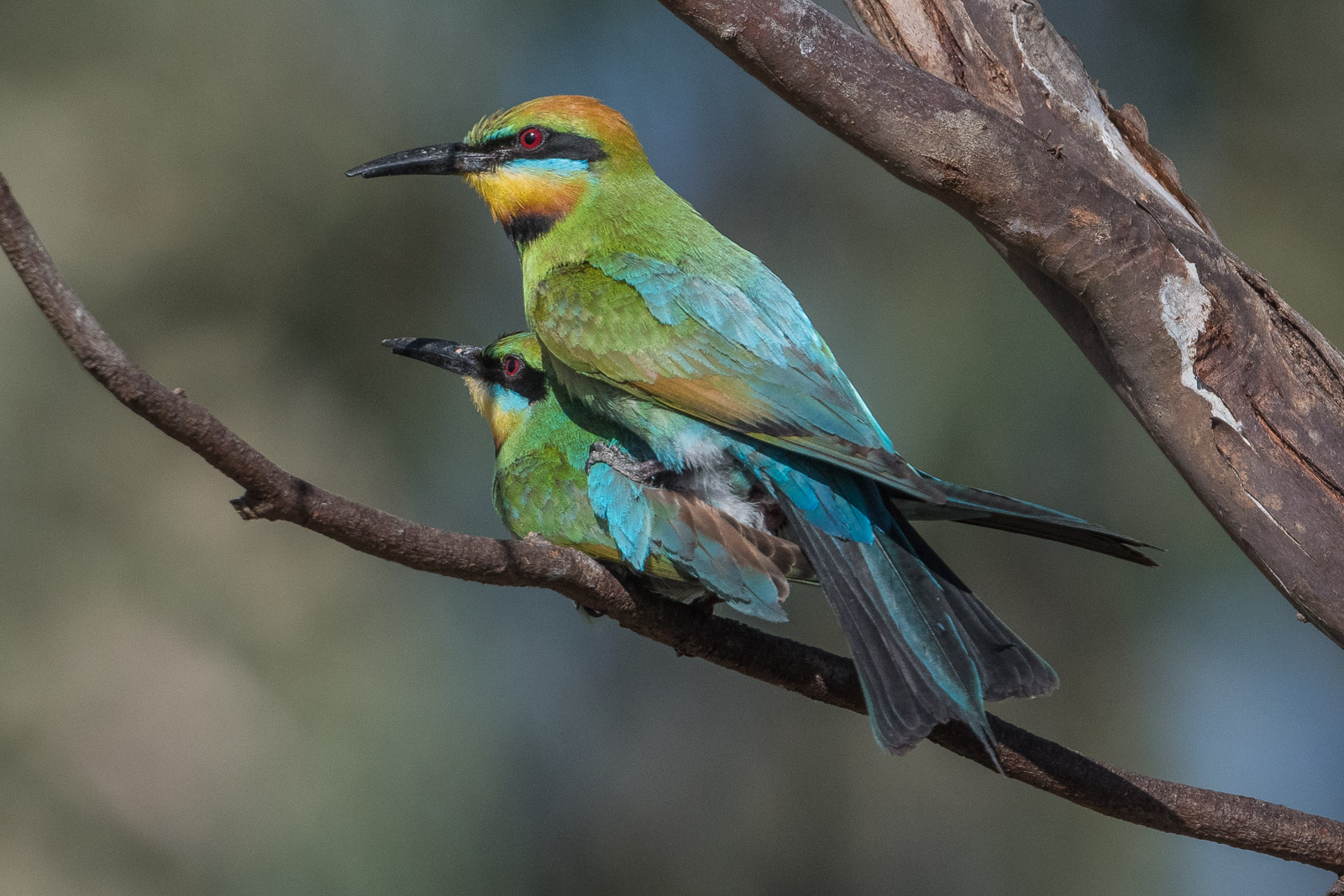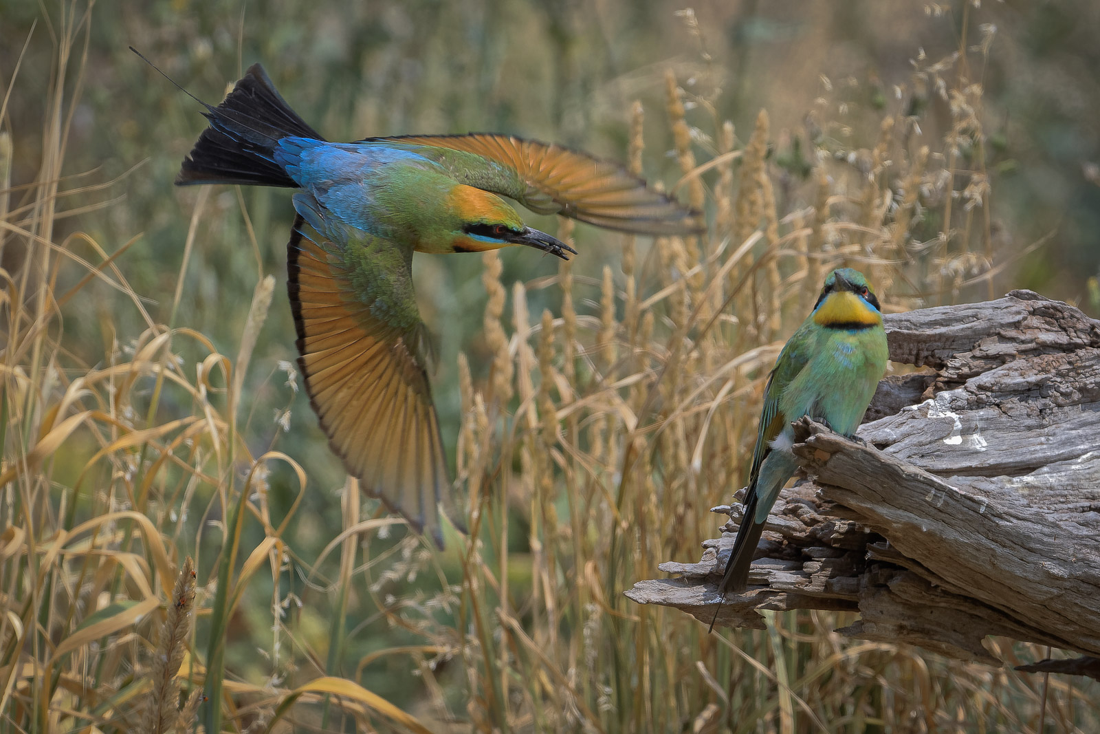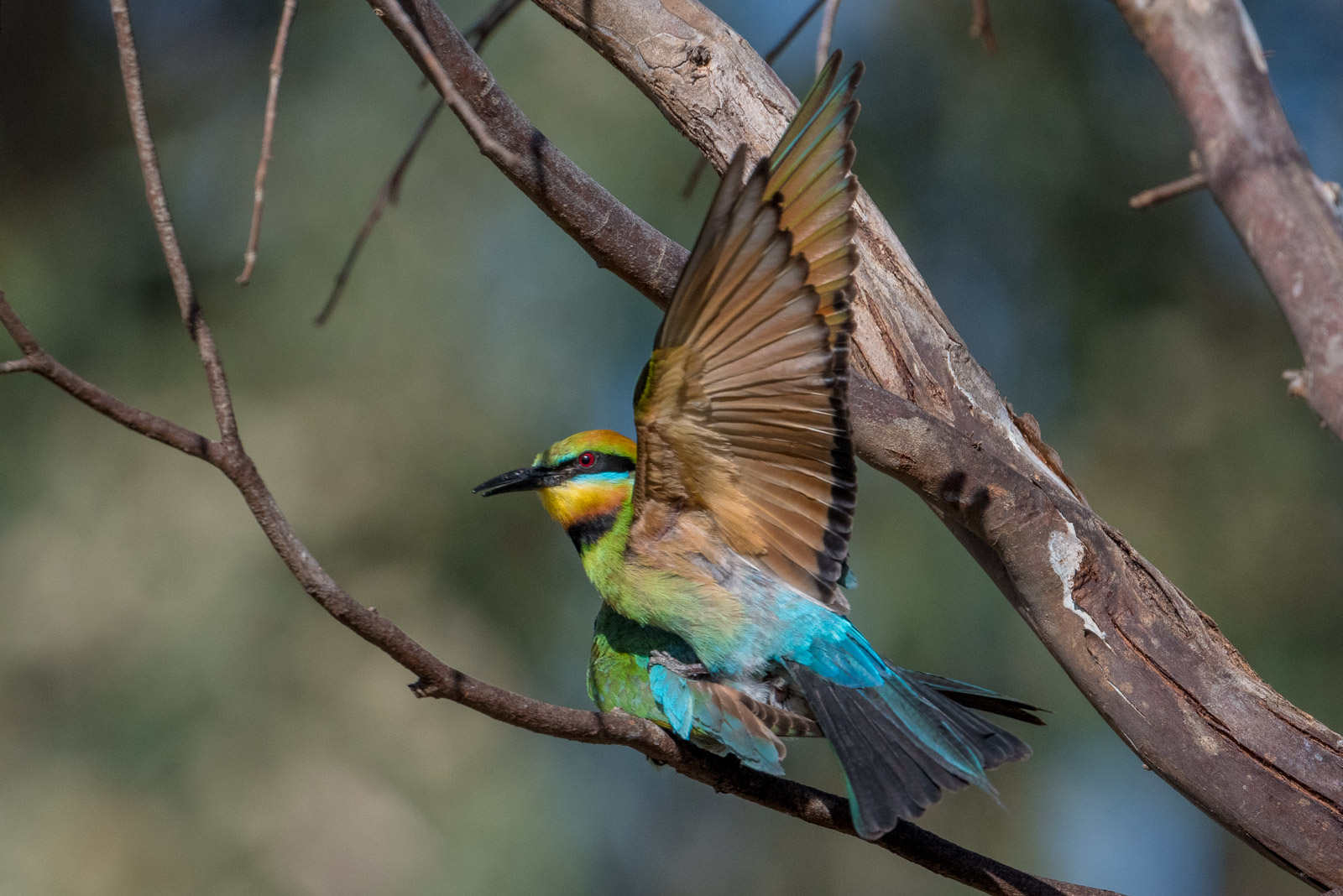 Rainbow Bee-eaters in our area generally nest in dry creek-beds burrowing into the sandy banks to form their nesting chambers. Most of the sites I know of are either on restricted access parks, or on private property farms. So it’s not unusual to go the whole season and not see or photograph them.