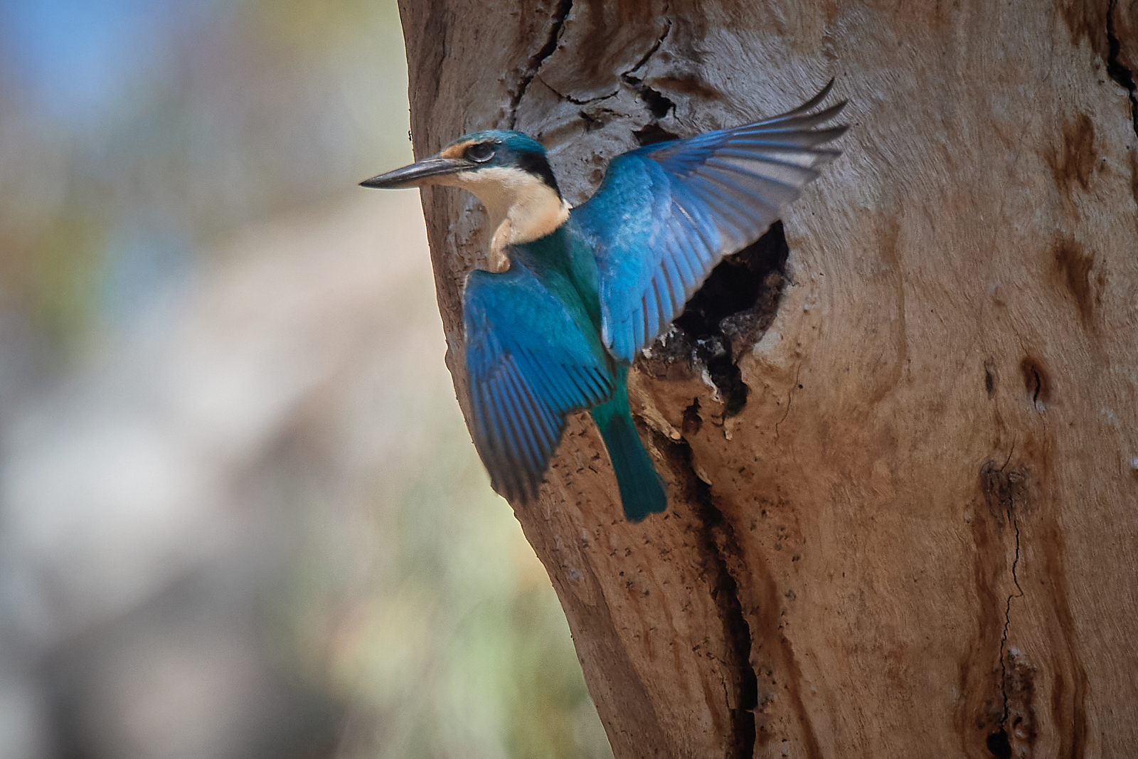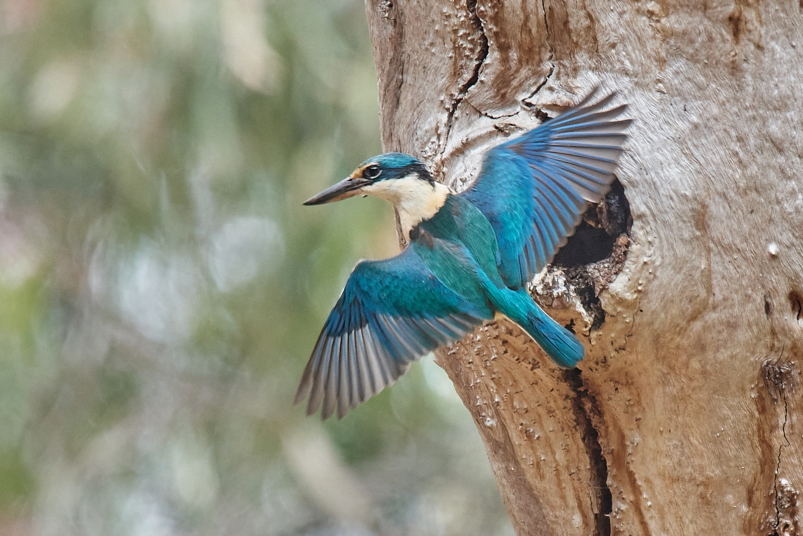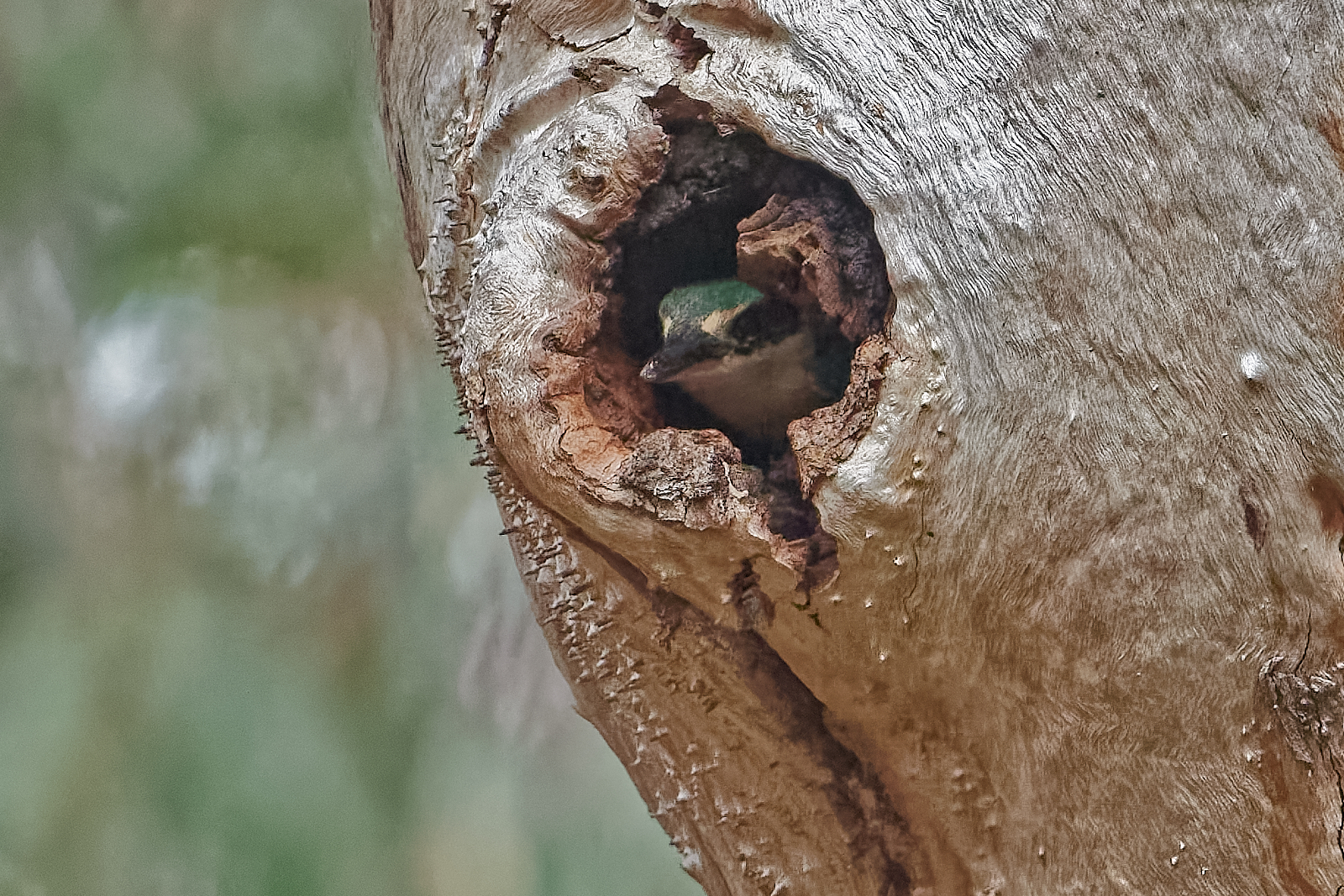 Sacred Kingfishers in our area come down from up north in late Spring and after a lot of calling through the forest, select a suitable small opening in an old tree and move in.