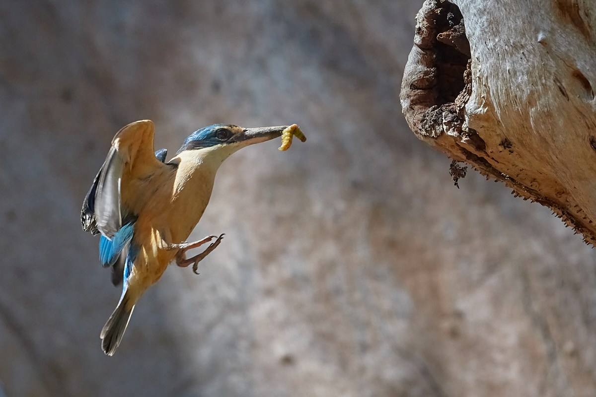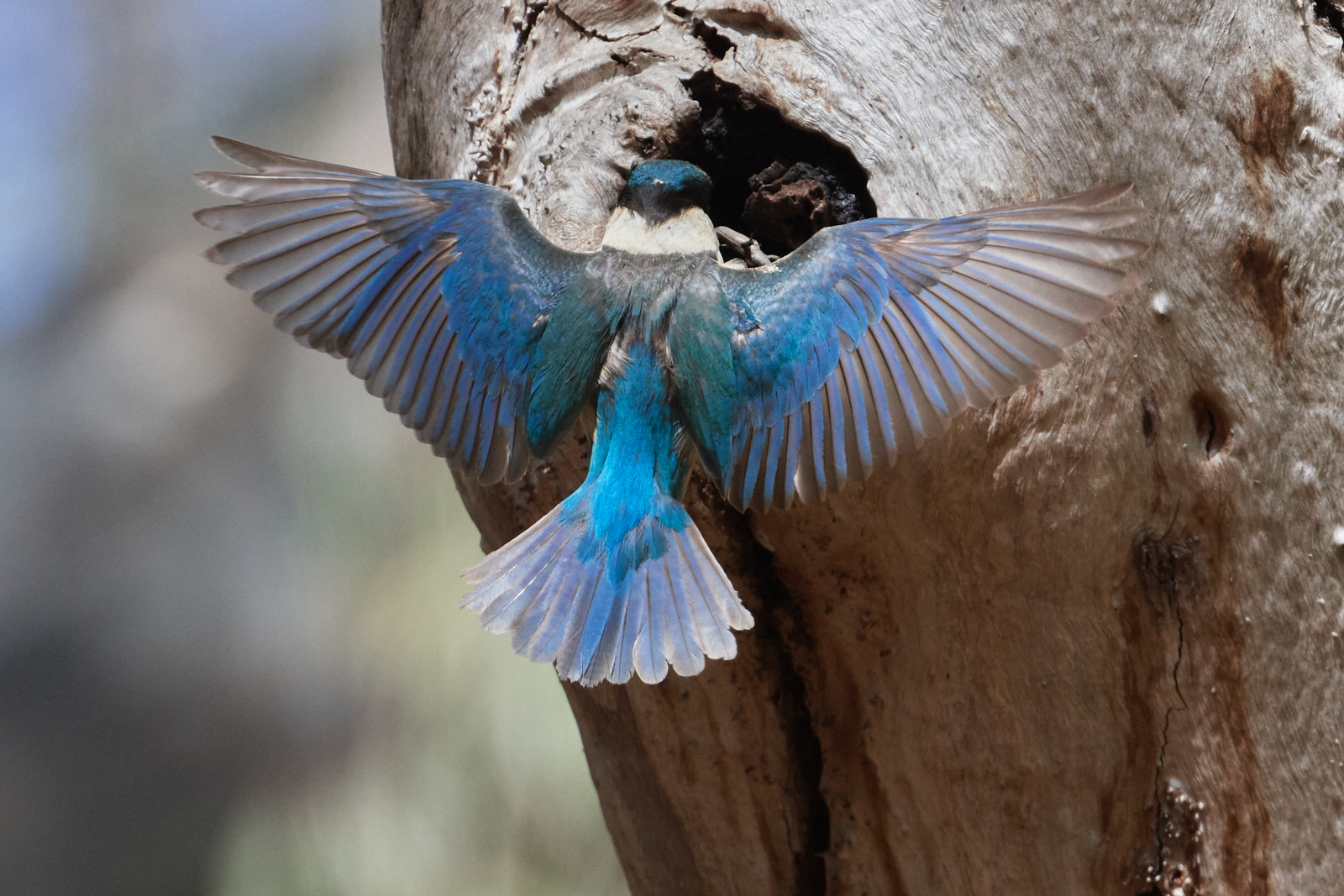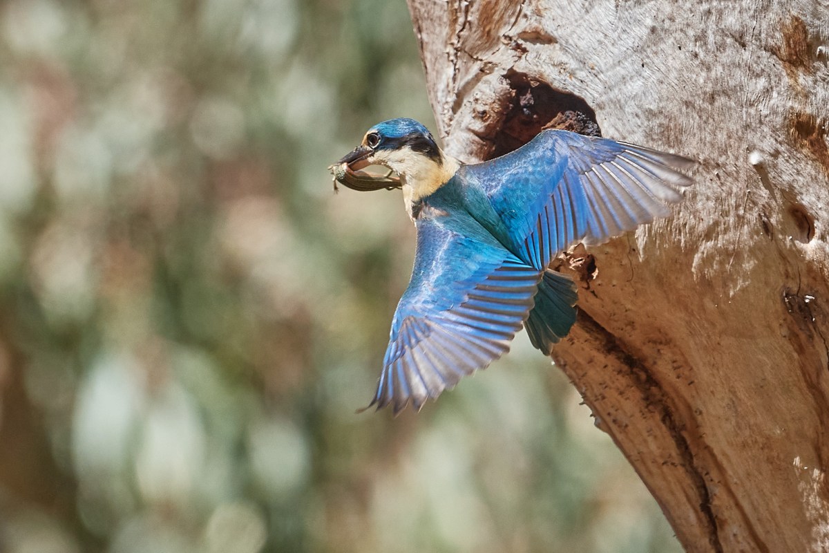 Sacred Kingfishers in our area come down from up north in late Spring and after a lot of calling through the forest, select a suitable small opening in an old tree and move in.