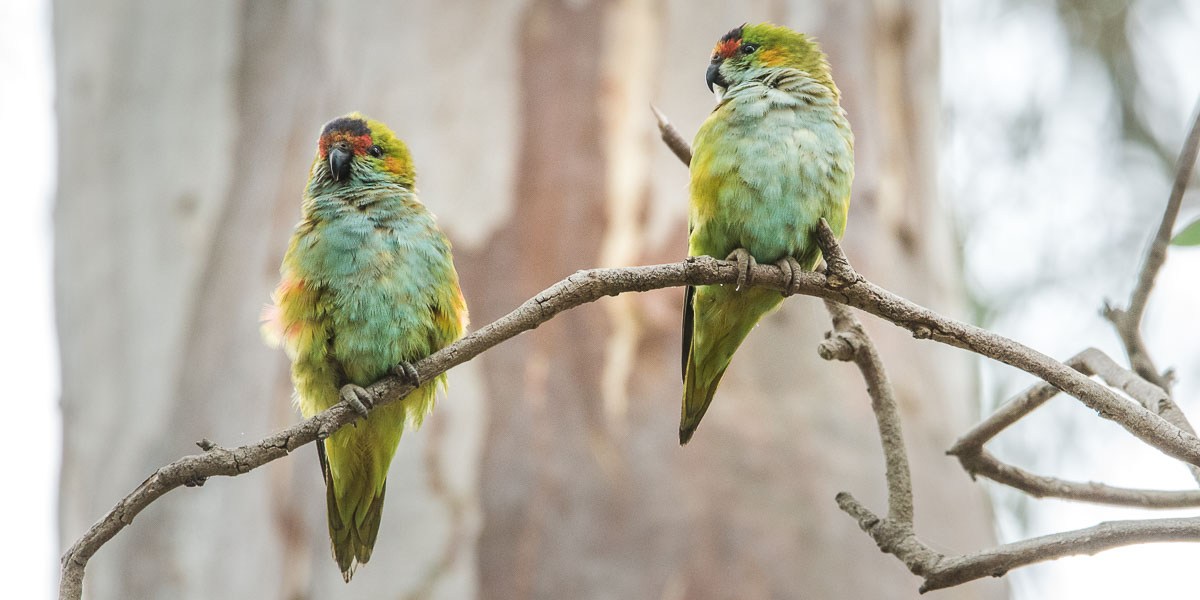 Take two Purple-crowned Lorikeets in preening mode. Have one of them decide that its more fun on the other side of the branch.