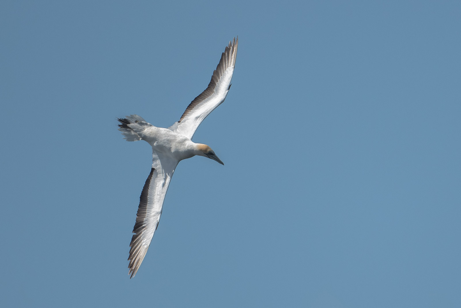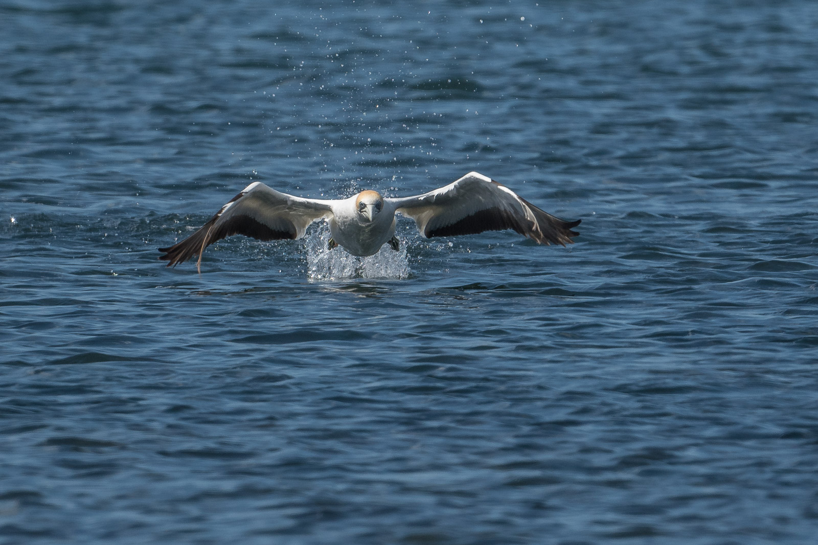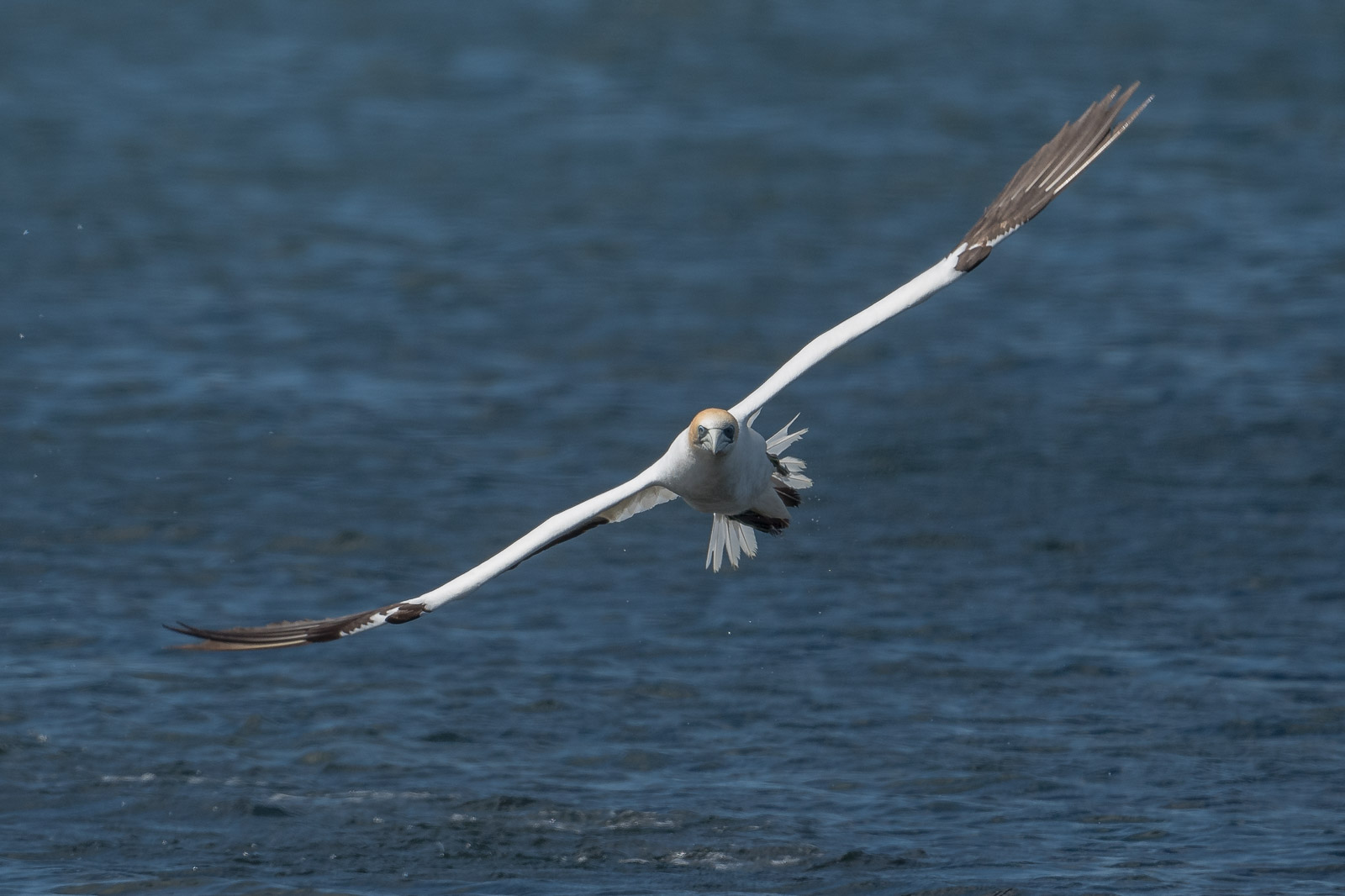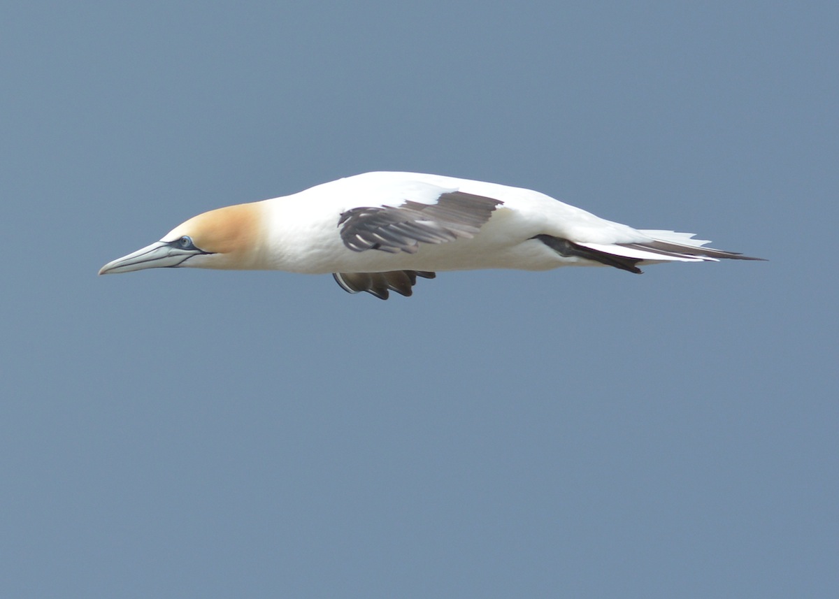 10 more minutes and the first gannets begin patrolling down toward me. Still a bit too far out for great results. They disappear up the bay. Wait.