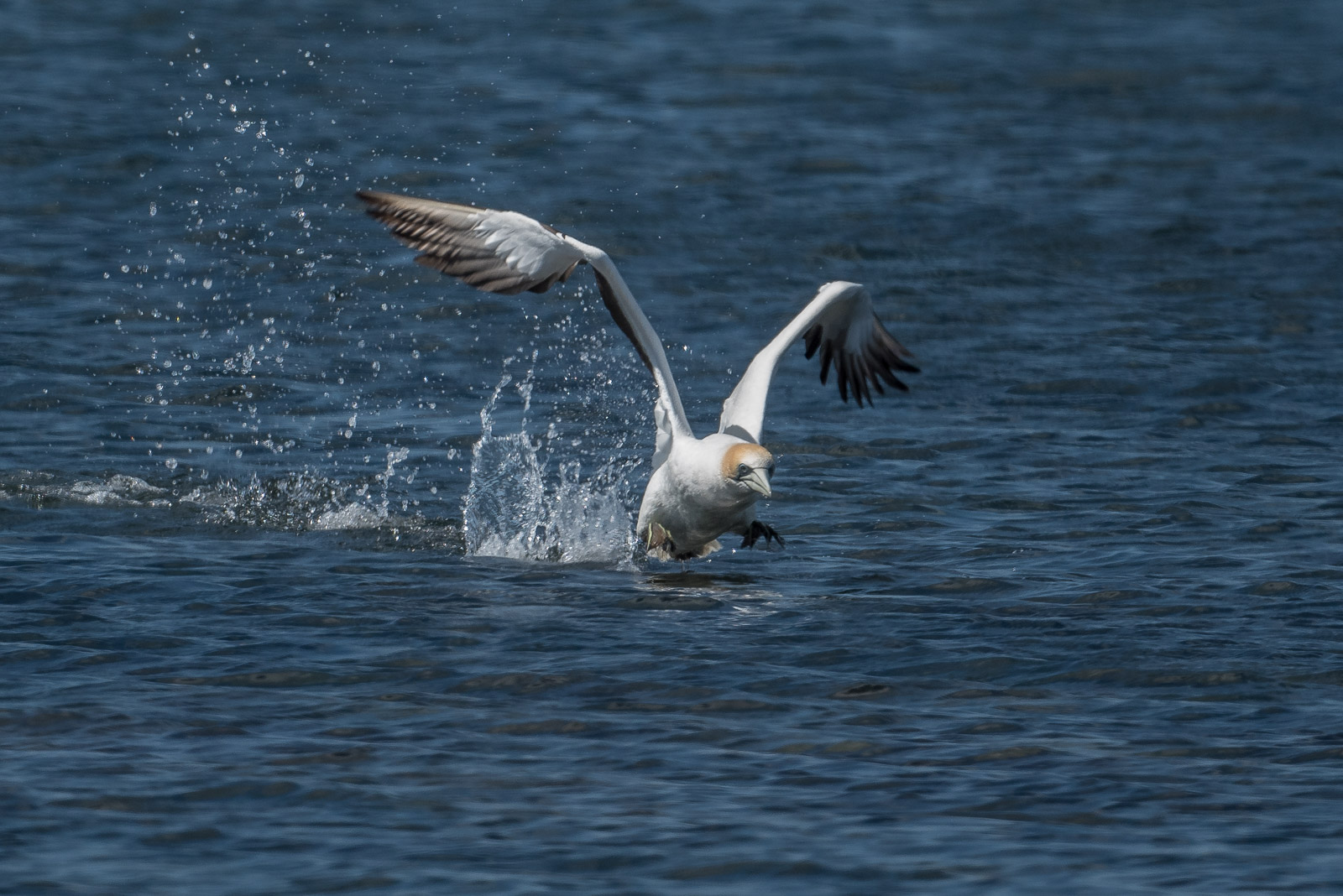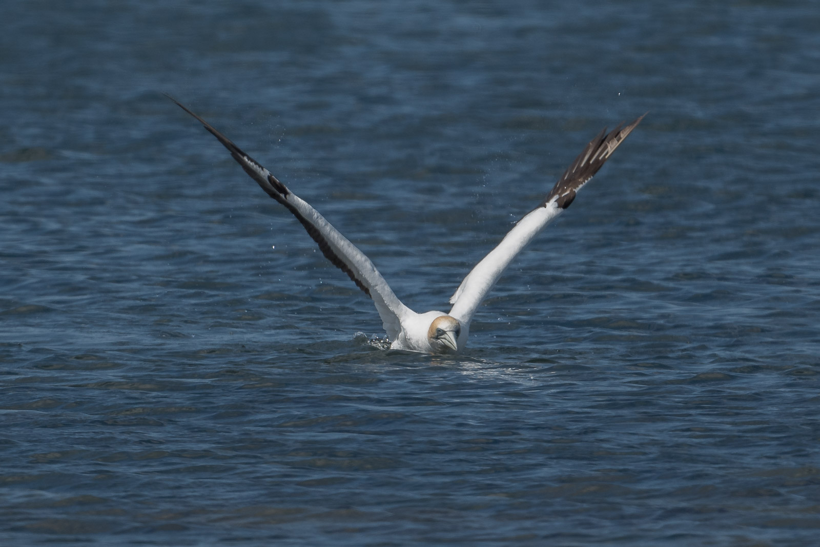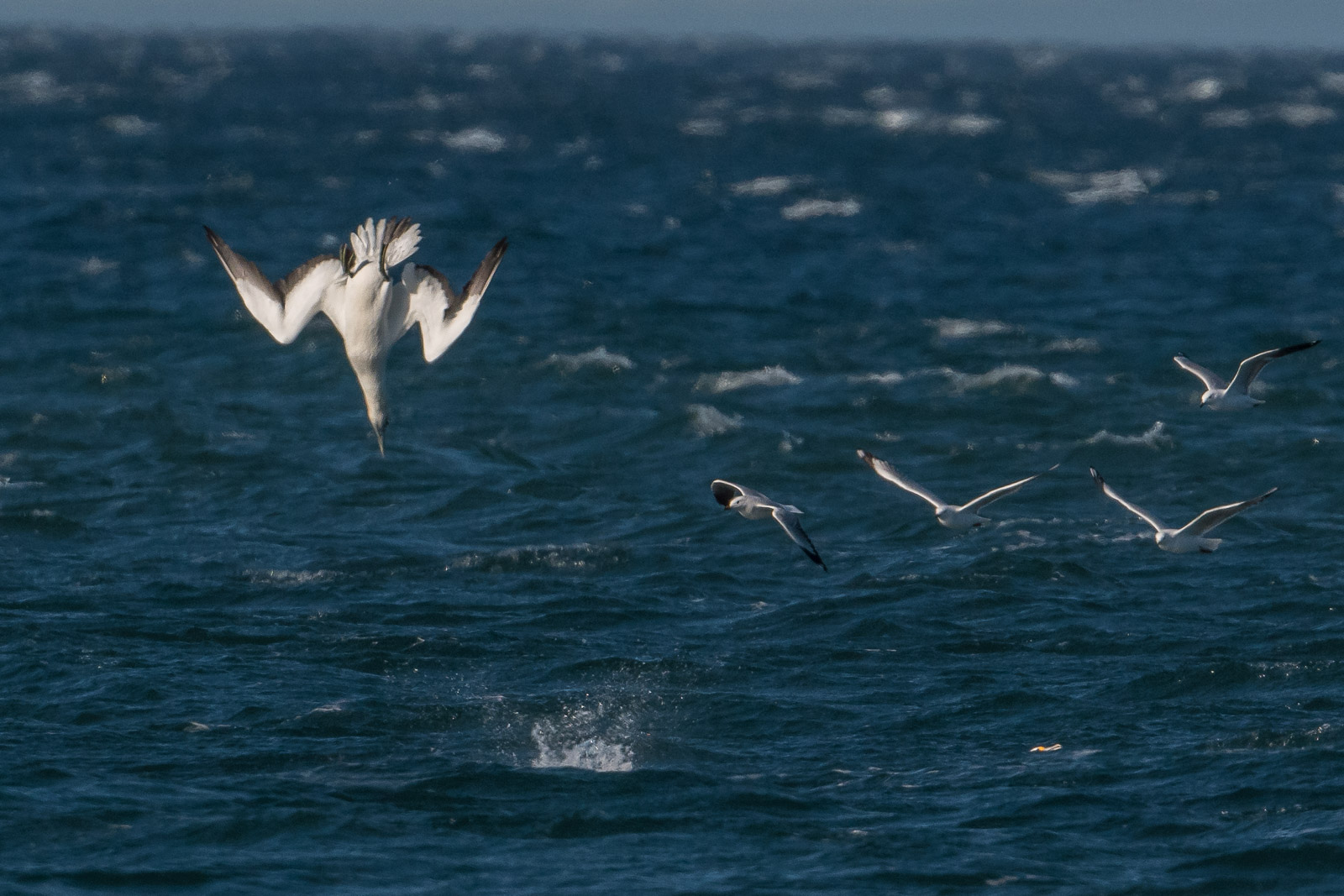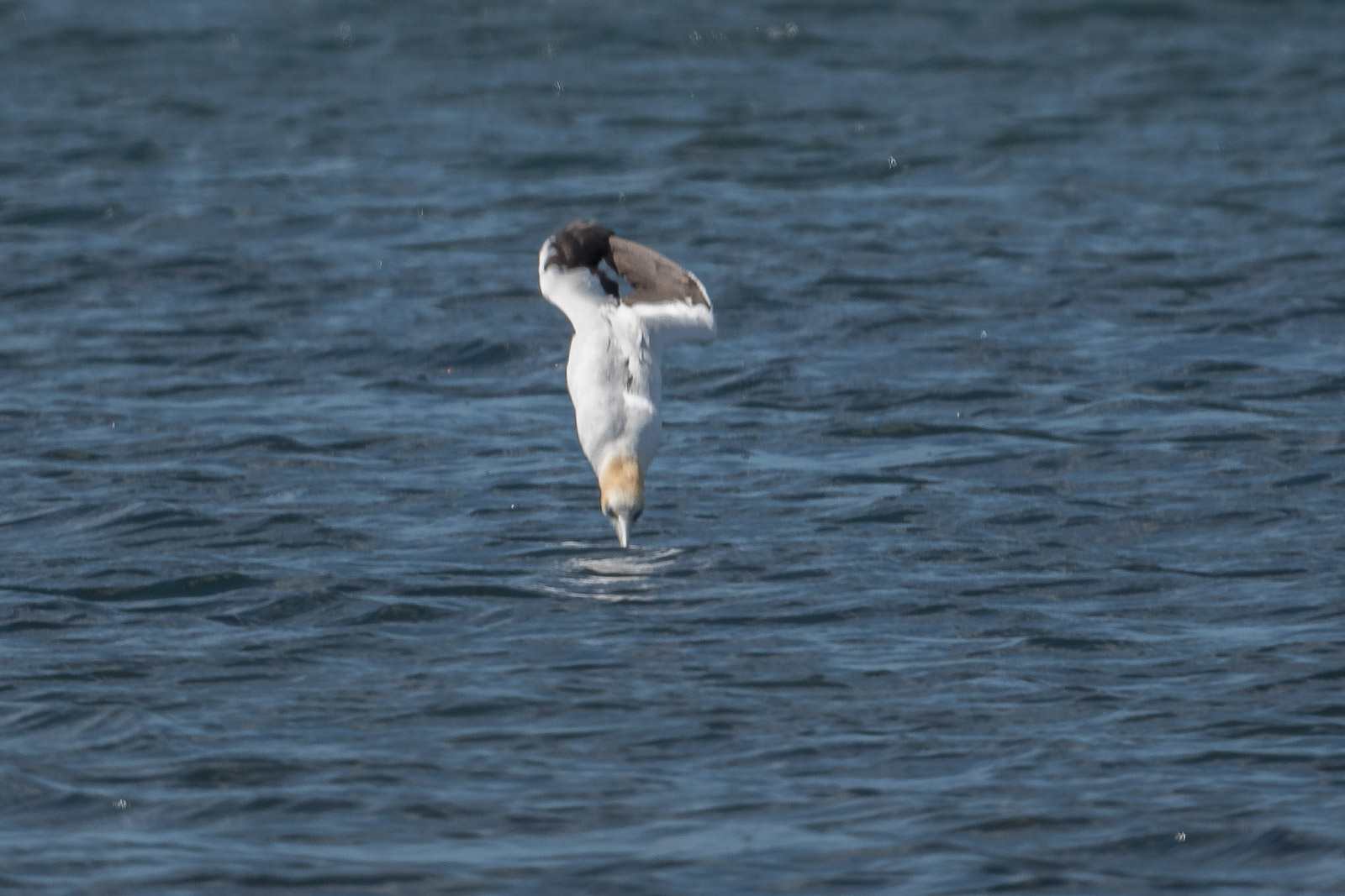 I’ve had several sessions with gannets out beyond the reef along the Point Cook coast and also down at Point Danger, near Portland. But these were frame filling birds, and because of the wind, they adopted quite a different approach to the attack. Normally we see them rollover and drop directly. But they seemed to drop the wings, hang out the legs, reduce speed and the torpedo-like slide into the water. Then after 10-15 seconds they must swim back up, as they fair bobbed out of the water, then settled back down to eat and prepare to takeoff. Fascinating.