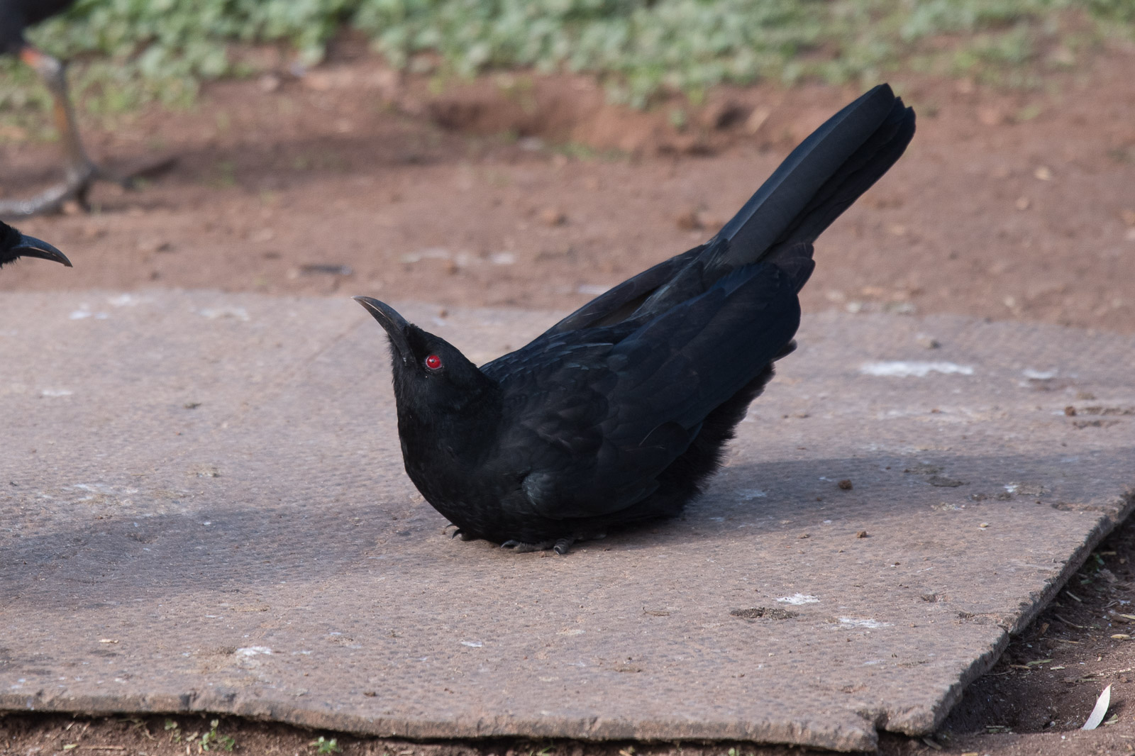 Inside the enclosure with the Brolga, there is a feeding station about brolga height. But rather attractive to your passing White-winged Chough. Except, they don’t have a good ‘hovering-flying’ technique, and so couldn’t access the food by sitting on the edge of the feeder. No where for them to attach.